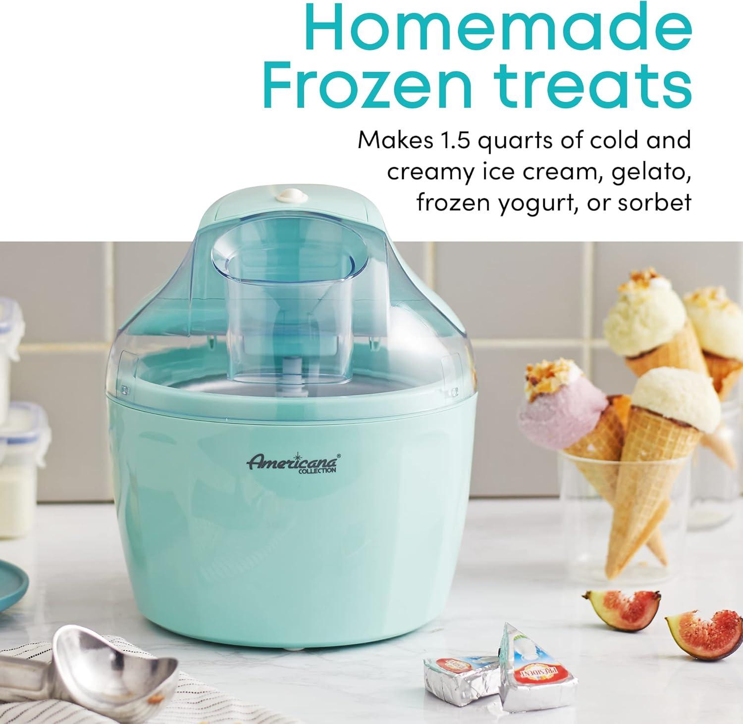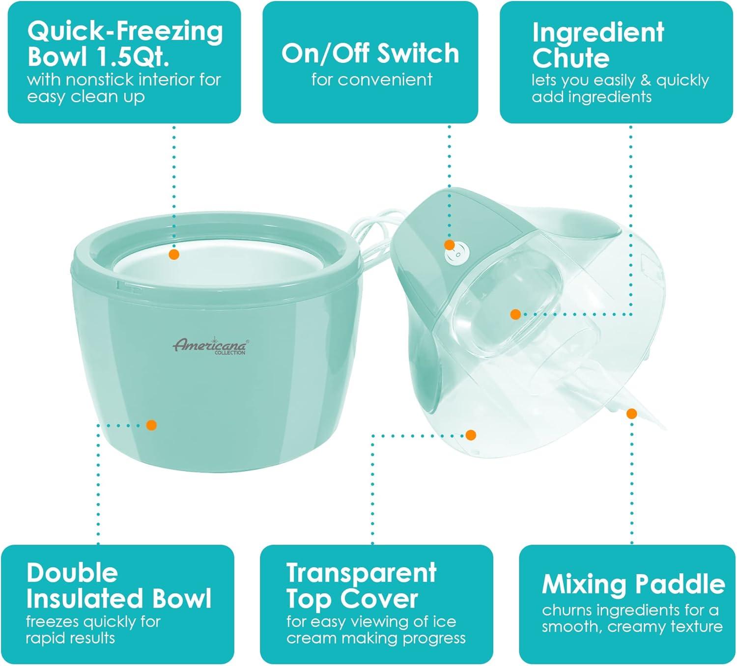 The Americana 1.5Qt. Electric ice cream maker churns out delicious homemade ice cream in less than 40 minutes. It features a 1.5-Quart quick freeze bowl and a powerful motorized paddle, so making ice cream is fast, convenient and fun for the whole family! It's great for entertaining at family parties, BBQ and picnics using all of your favorite ice cream, sorbet, gelato and even frozen yogurt recipes. The motor turns the paddle that whips air into the ingredients producing a smooth, rich soft serve ice cream. The paddle quickly crushes cookies, fruit, chocolate chips or a variety of other yummy toppings and thoroughly integrates them into the mixture. All parts conveniently remove for easy cleaning.