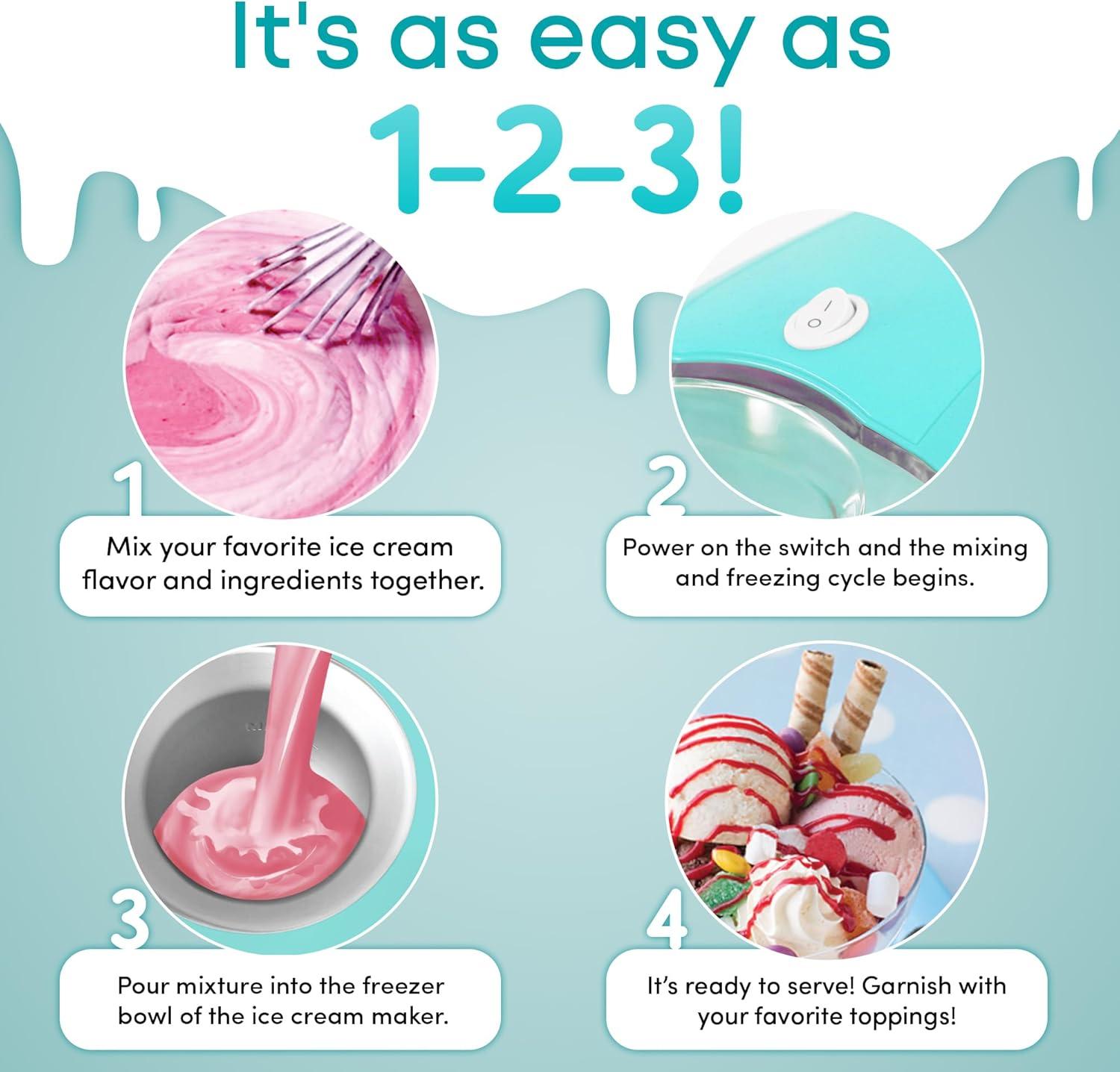cQUICK & EASY TO USE: The ice cream and dessert maker is simple to use. Simply freeze the bowl overnight, then add the ingredient mixture into the machine, push a button and you'll have a tasty dessert in a short time.