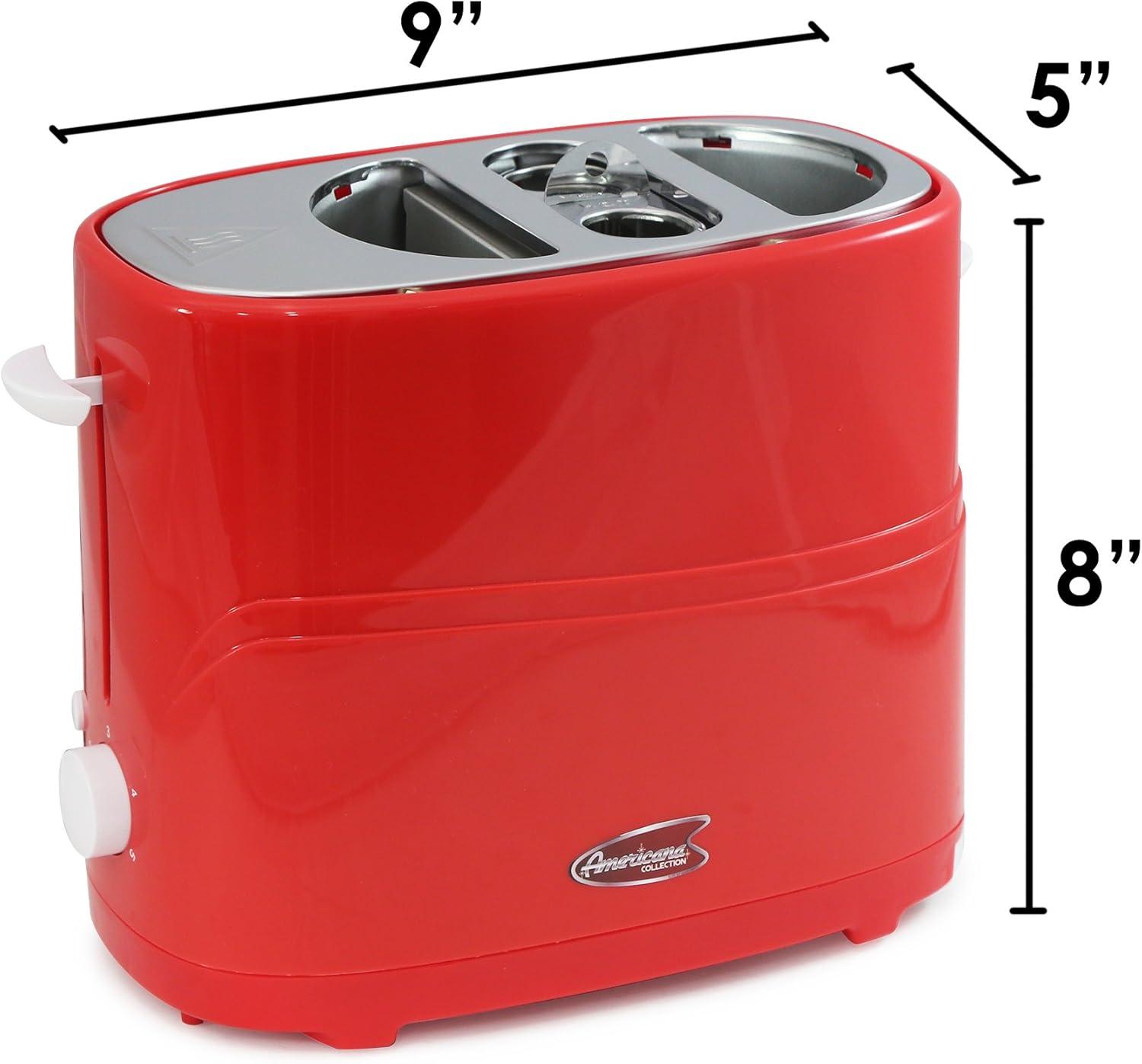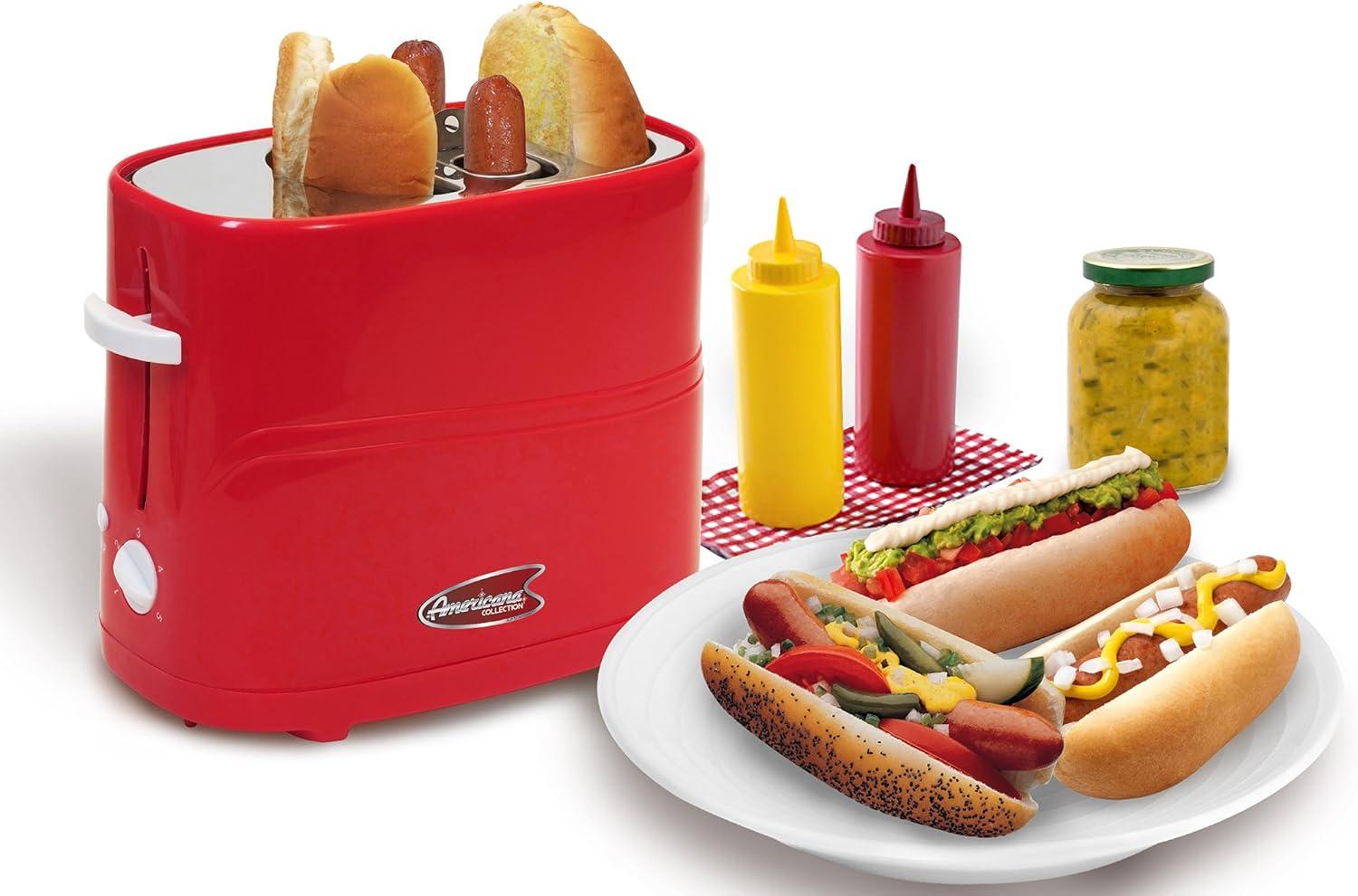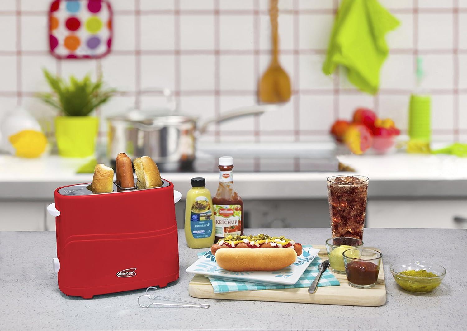 Elite by Americana ECT-542R Retro Pop-Up Hot Dog and Bun Toaster Cooker Machine with Tongs, Heat Veggie Links Kosher Beef Turkey Sausages Bratwurst, 2 Slice, Red(Red)