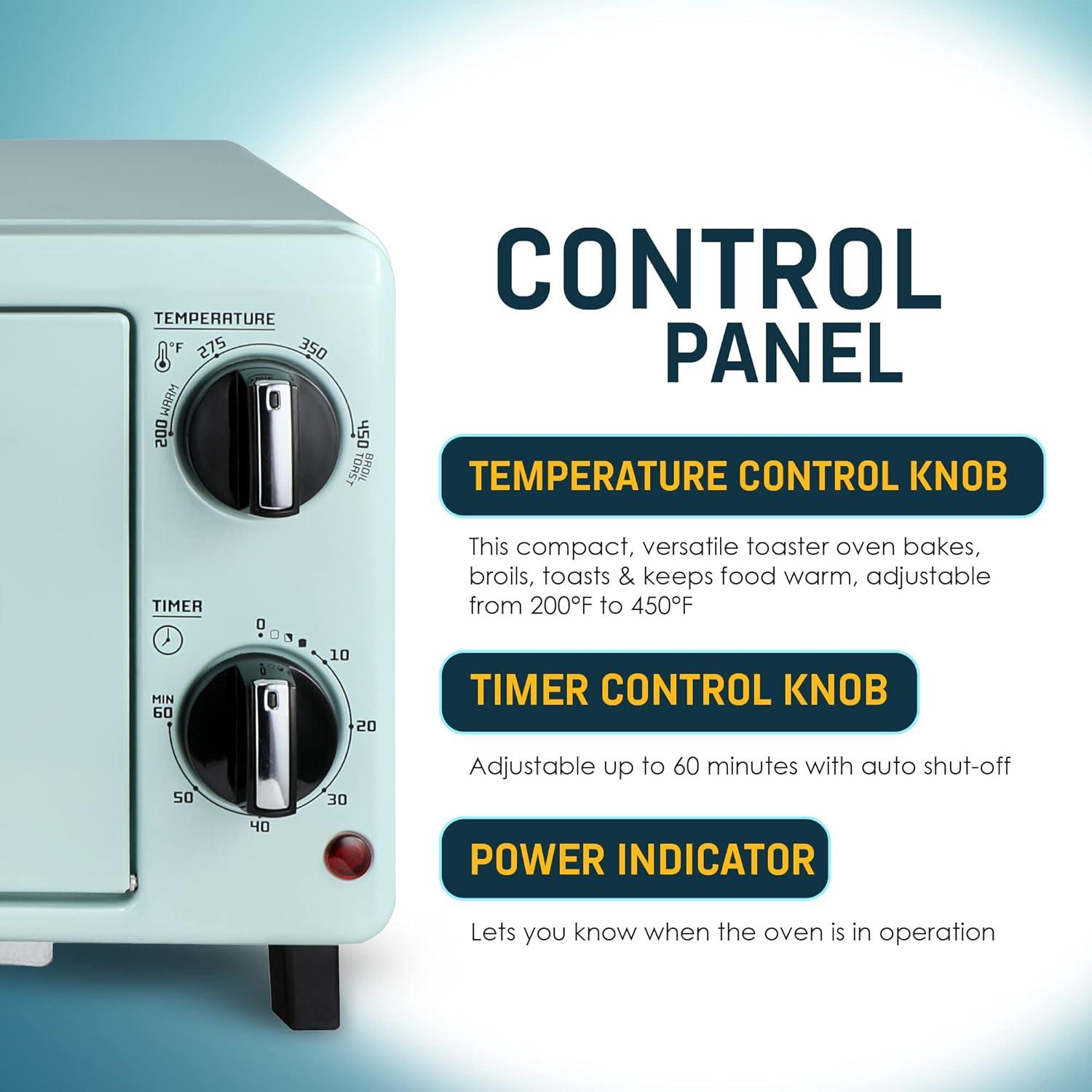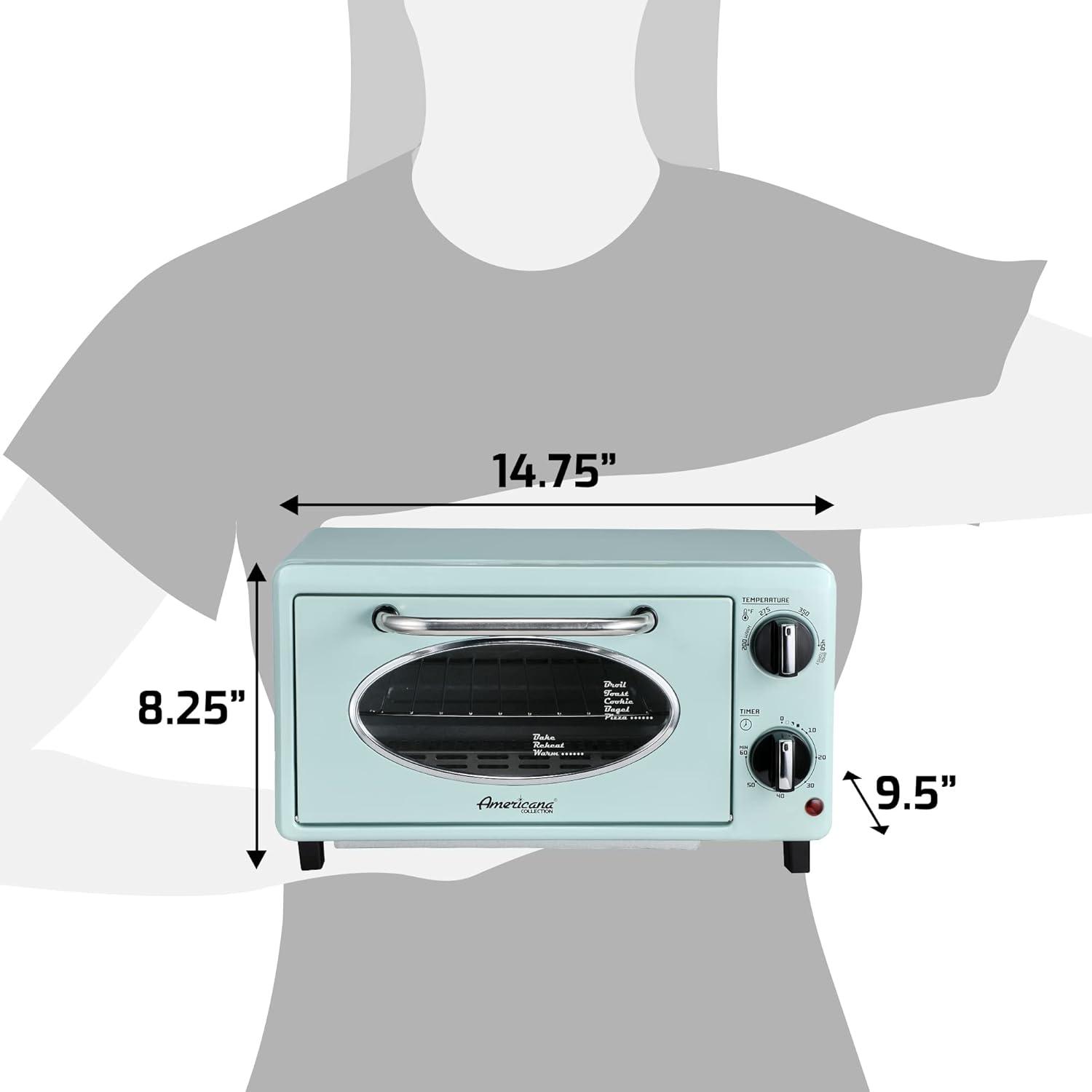 Add a touch of class and sophistication with the Americana Vintage Art Deco Retro-style Toaster Oven. Toast up to 2 slices of bread, bagels, an 8” personal pizza or broil an open-faced sandwich. With an adjustable 60-minute timer, baking and roasting is fast, easy and delicious. It uses modern-day technology of 1000 watts heated glass tube elements for the ultimate heating system and control. Clean-up is also a cinch with a slide out crumb and drip pan.