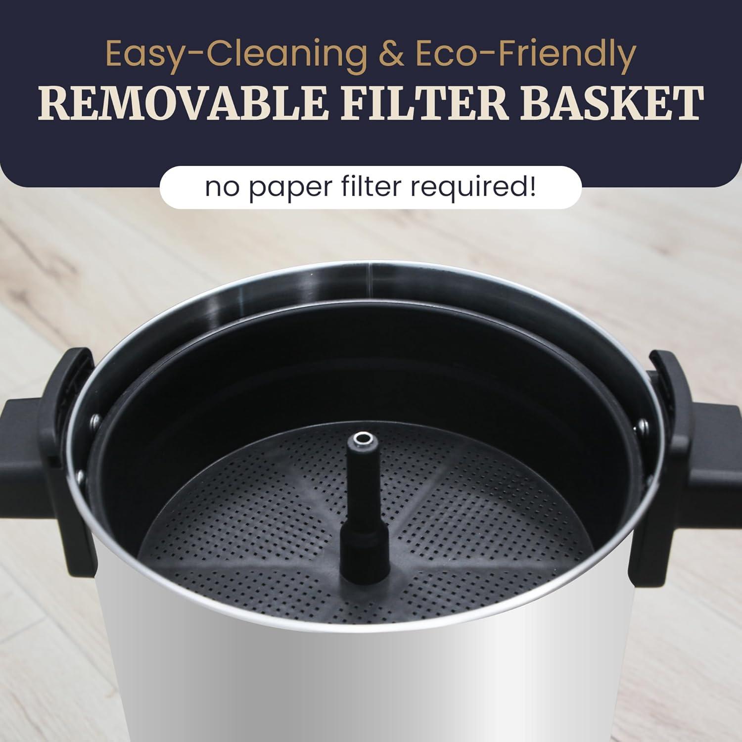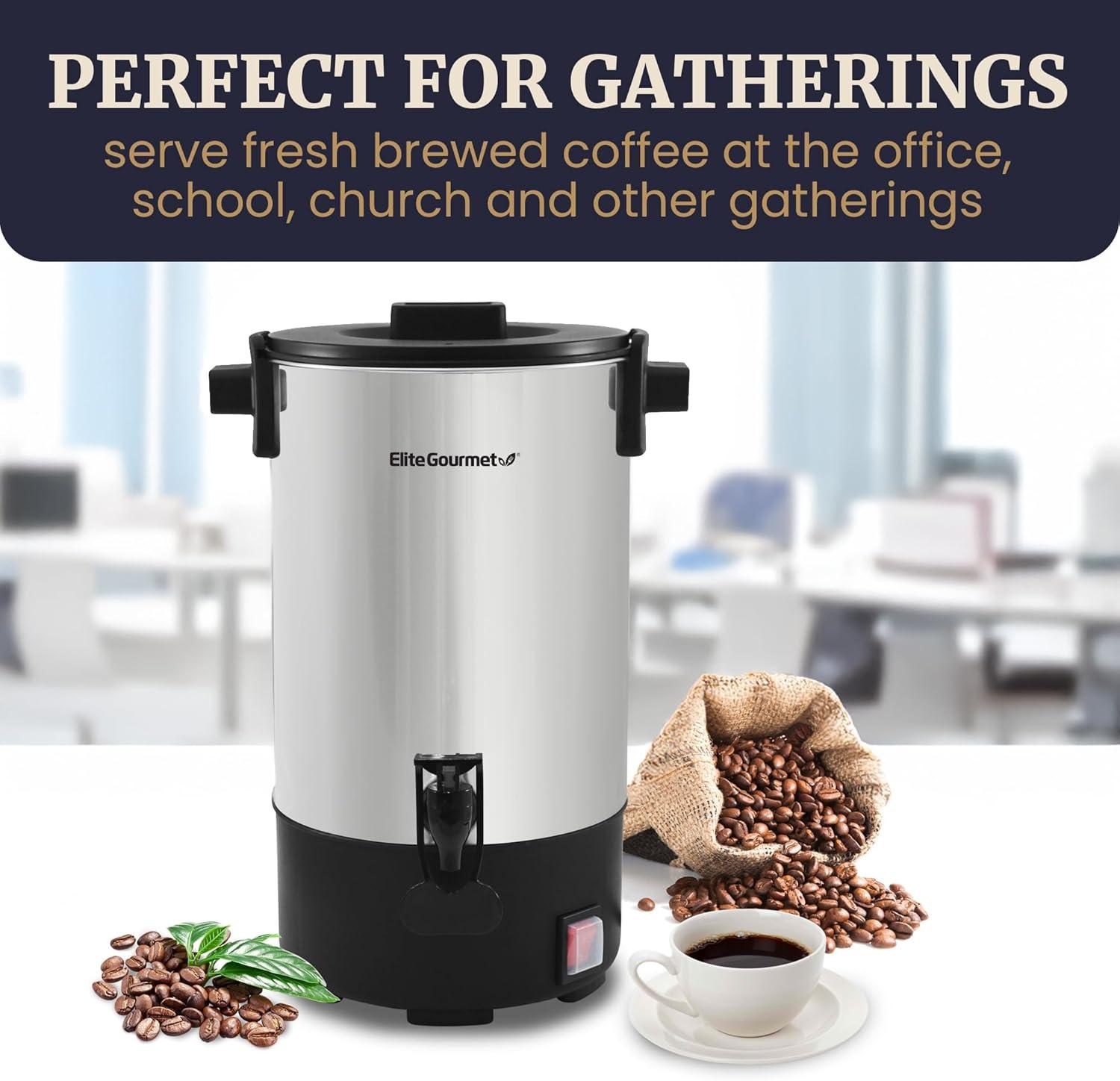 Designed to serve large parties, the Elite Gourmet 30-cup Coffee Brewer is the best solution for office breakrooms and social gatherings. Brew time is around 1 minute per cup, which means your high volume gathering will be refreshed and energized in no time! Internal water level markings allow you to fill the brewer to the desired serving amount so you can make just the right amount of coffee or plenty extra. Constructed in an attractive Stainless Steel interior and exterior finish for easy cleaning and a great look! Heat resistant handles and a locking lid allow for safe carrying and transport. A high flow, drip-less dispenser allows you to fill single servings or carafes with ease! Forget wasteful paper filters! The Elite Gourmet Coffee Brewer features a removable plastic filter for quick and easy cleaning.