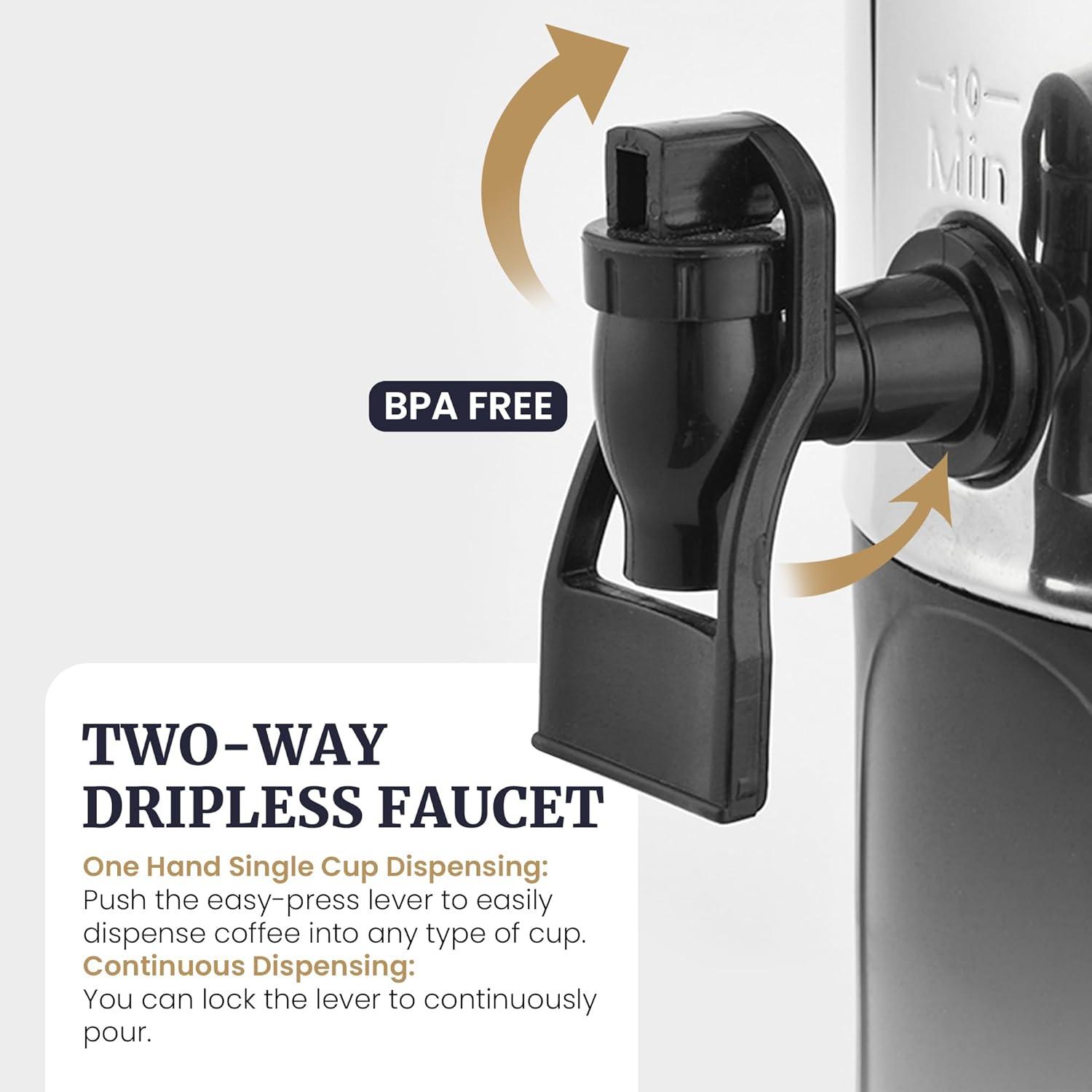 CONVENIENT 2-WAY DISPENSING: Allows guests to fill one single cup with a quick flip of the lever. Or flip the lever completely down to continuously fill a larger carafe.
