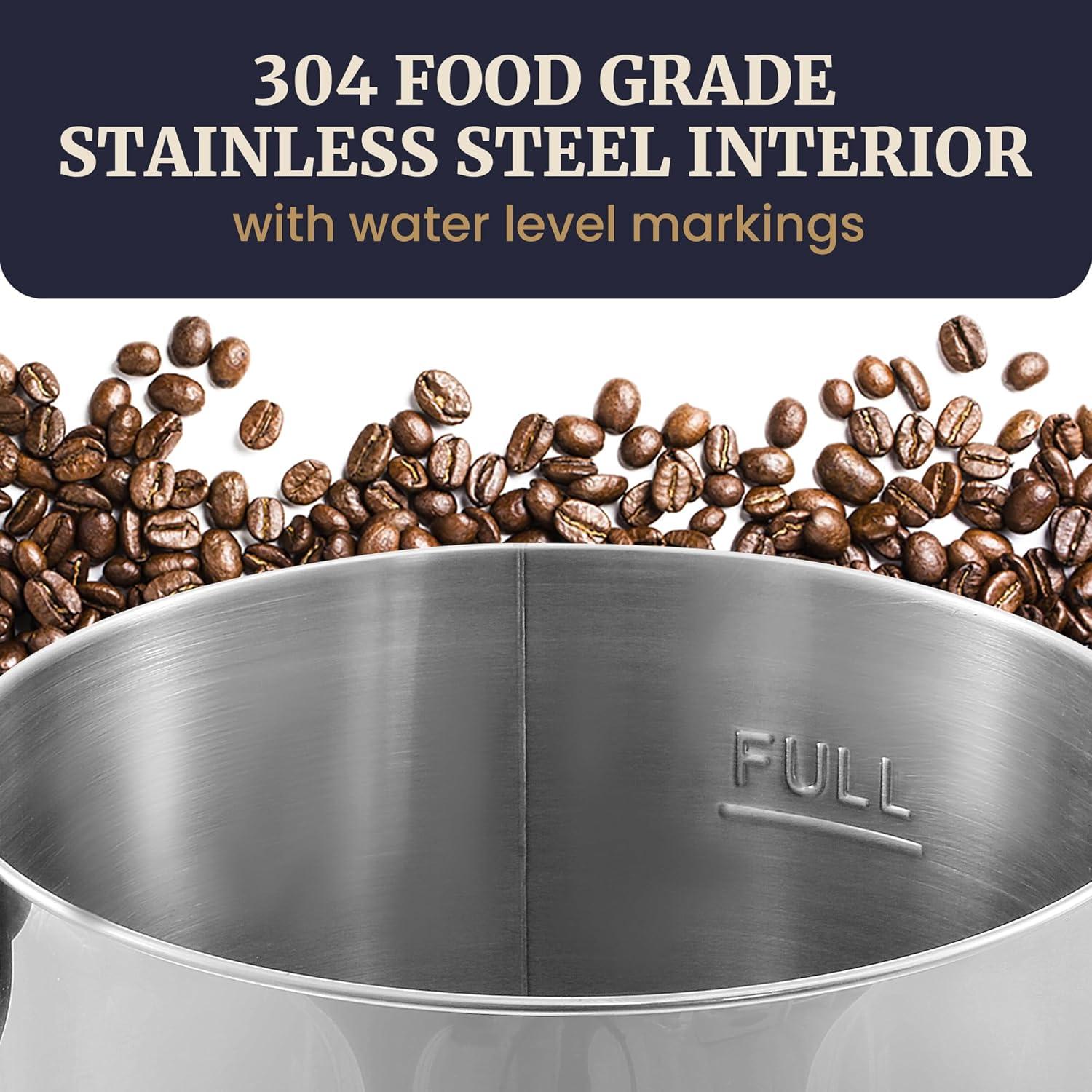 BEAUTIFUL BRUSHED STAINLESS STEEL interior with easy-to-read water level markings. Plus an easy-clean coffee filter basket so no paper cone filters are necessary.