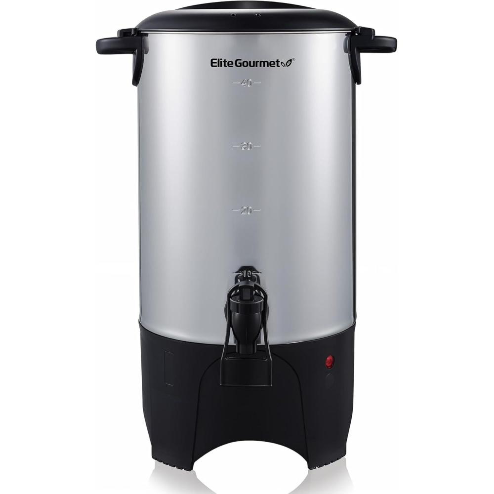 Designed to serve large parties, the Elite Gourmet 40-cup Coffee Brewer is the best solution for office breakrooms and social gatherings. Brew time is around 1 minute per cup, which means your high volume gathering will be refreshed and energized in no time! External water level markings allow you to fill the brewer to the desired serving amount so you can make just the right amount of coffee or plenty extra. Constructed in an attractive Stainless Steel interior and exterior finish for easy cleaning and a great look! Heat resistant handles and a locking lid allow for safe carrying and transport. A high flow, drip-less dispenser allows you to fill single servings or carafes with ease! Forget wasteful paper filters! The Elite Gourmet Coffee Brewer features a removable plastic filter for quick and easy cleaning.
