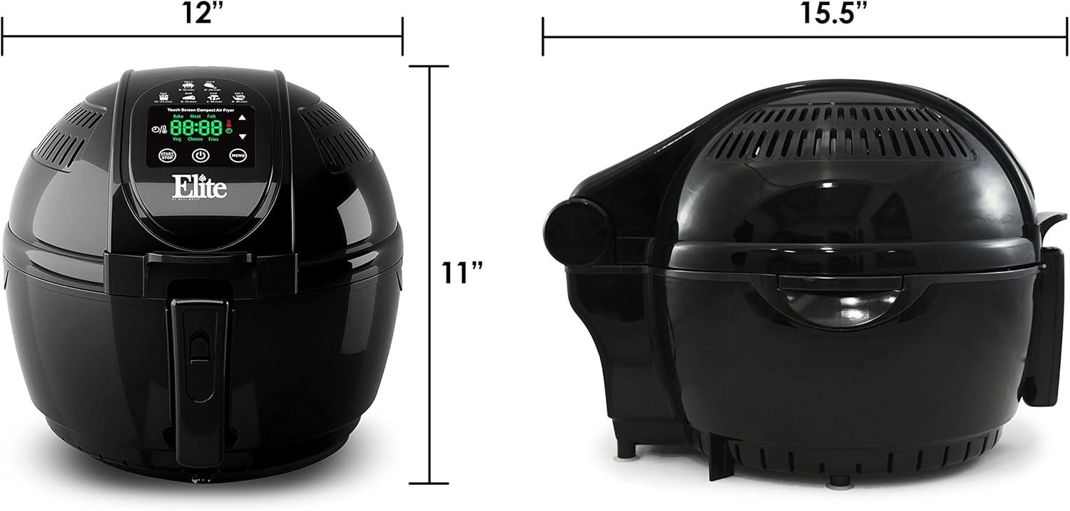 The easy, healthy way to fry Health-conscious eating doesn't have to mean giving up all of your favorite crispy delights like French fries, chicken and doughnuts. The Elite Platinum Air Fryer lets you indulge your cravings without the guilt. Its high-powered convection fan rapidly circulates hot air around foods in the cooking basket, producing crispy, delicious foods with just a fraction of the oil of traditional frying methods. There is no guesswork involved with these 6 Quick Menu functions: Bake, Meat, Fish, Cheese, Veggies, and Fries and adjustable temperatures from 149°F to 400°F. Cleaner, safer cooking made easy The Elite Platinum Air Fryer requires little to no oil so your days of painful hot-oil splatters on your hands and arms are over. Advanced touch screen technology includes a 60-minute timer with automatic shut-off, and a cool-touch handle lets you safely remove the pan after cooking. Fry basket boasts a food-safe non-stick coating, making clean-up quick and easy. This compact fryer takes up minimal counter space, making it perfect for apartments and dorms. Its sleek, stylish appearance ensures that it would be a much appreciated housewarming or wedding gift. Quality you can count on Our 1400-watt digital air fryer is ETL approved for your peace of mind. Additionally, every Elite Platinum Air Fryer is covered by our 1 year Limited Warranty against manufacturer defects. In the unlikely event that it ceases to perform as promised under normal use, contact us for a replacement. Get the taste you love, without the guilt. Add the Elite Platinum Electric Digital Air Fryer to your cart today.