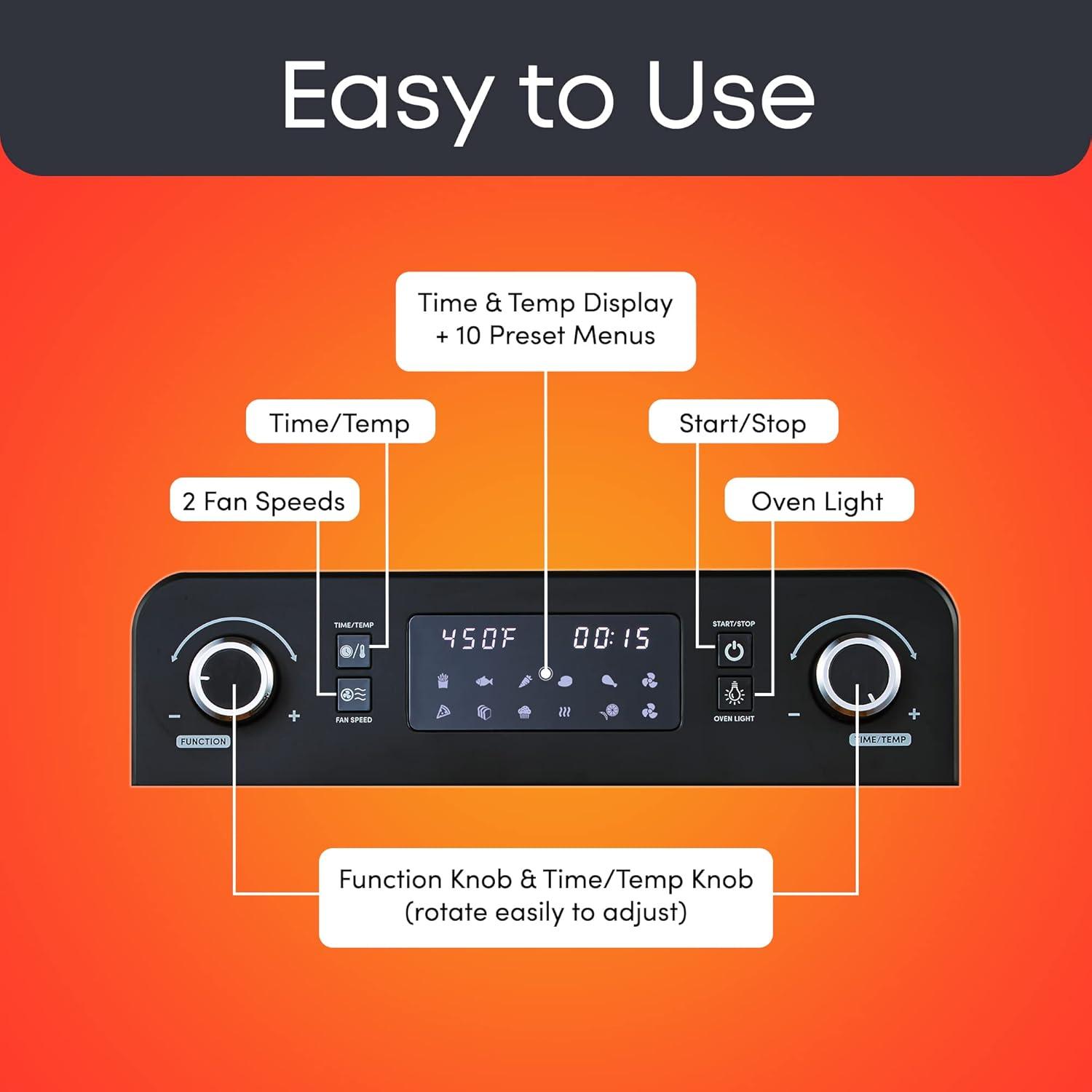 ADJUSTABLE TIME AND TEMPERATURE dials give you the ultimate in cooking control and versatility allowing you to fry, bake, grill and roast all in one! A high-power convection fan envelopes food in temperatures from 0 to 450F degrees and a 60-minute timer automatically shuts off the oven at the end of the cooking cycle.