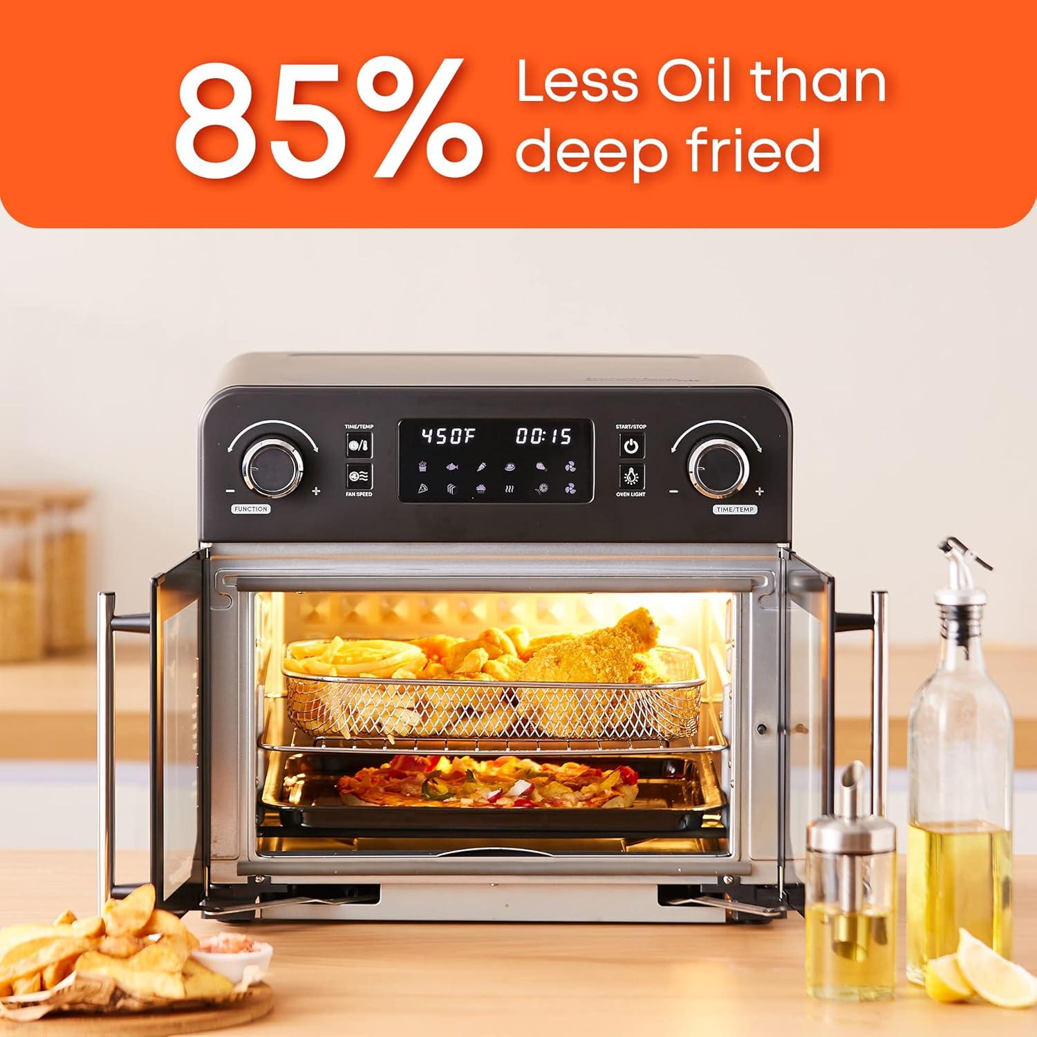 AIR FRYING IN AN OVEN is Oil-free & Delicious. It uses up to 75% less fat than traditional frying methods. The Toaster Oven Air Fryer uses cooking technology by circulating 360°hot air within the oven, resulting in crunchy food with little or no oil, promising you healthy eating as well as great flavor.