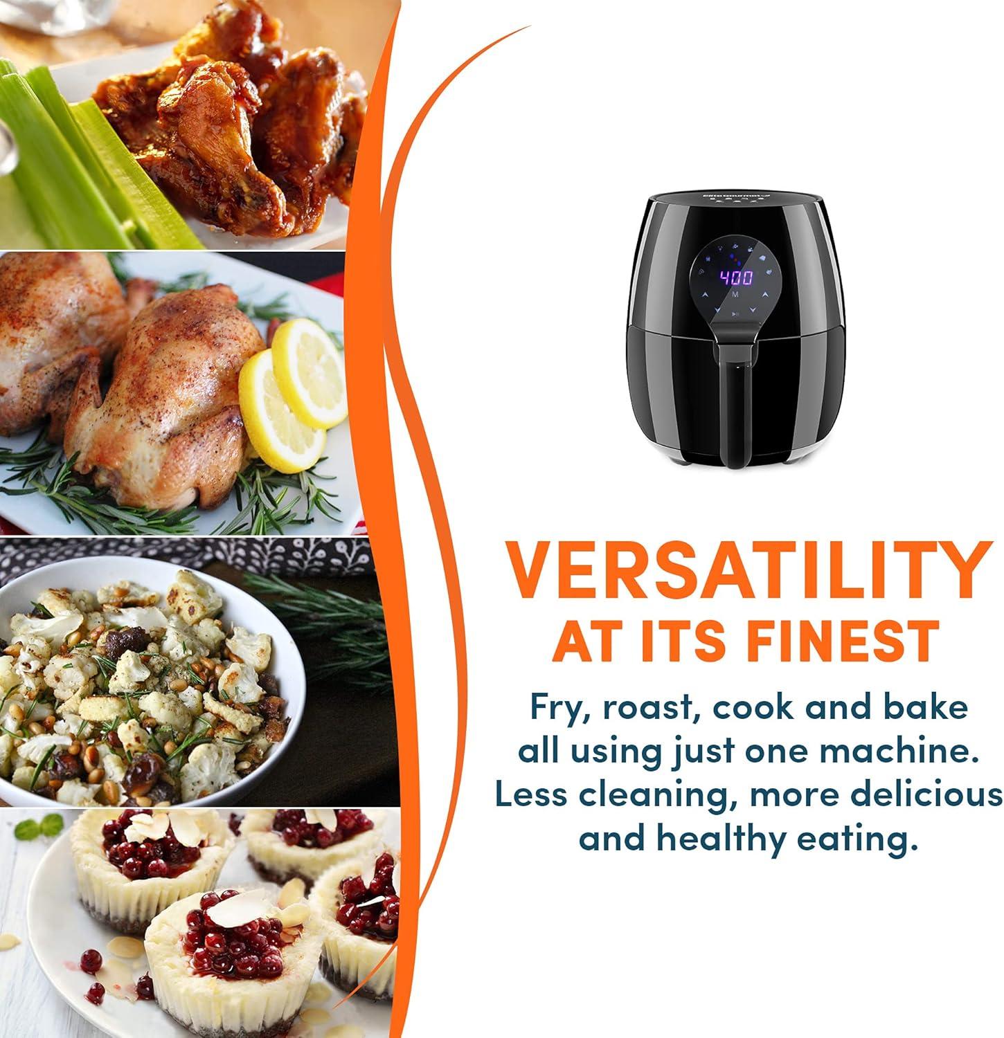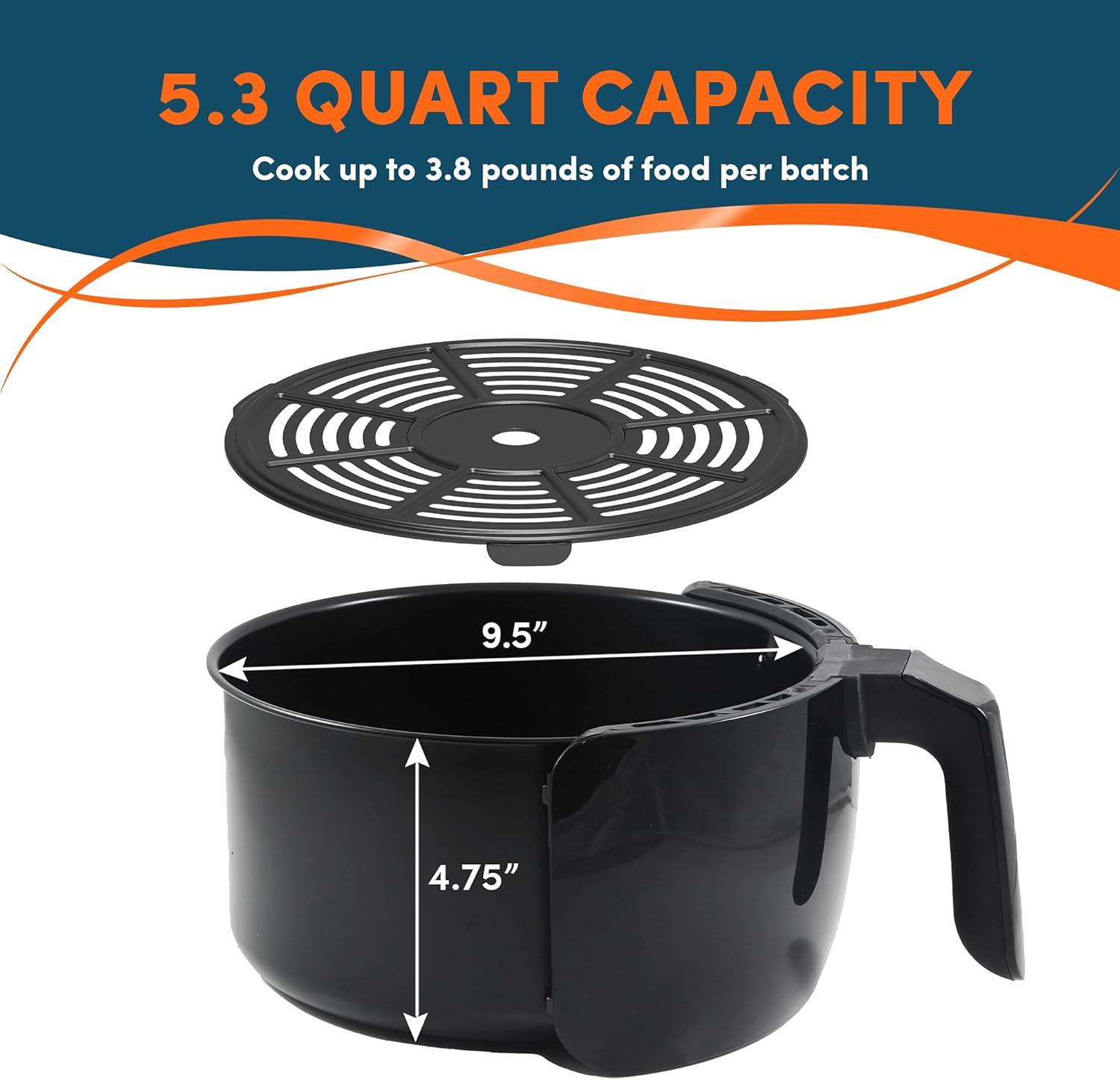 EXTRA LARGE CAPACITY: The non-stick basket holds 5.3 quarts or up to 3.75lb of food, perfect for family-sized meals. Cook healthier, faster and more safely than deep frying in oil, eliminating splatter, fatty oils and reducing electricity use