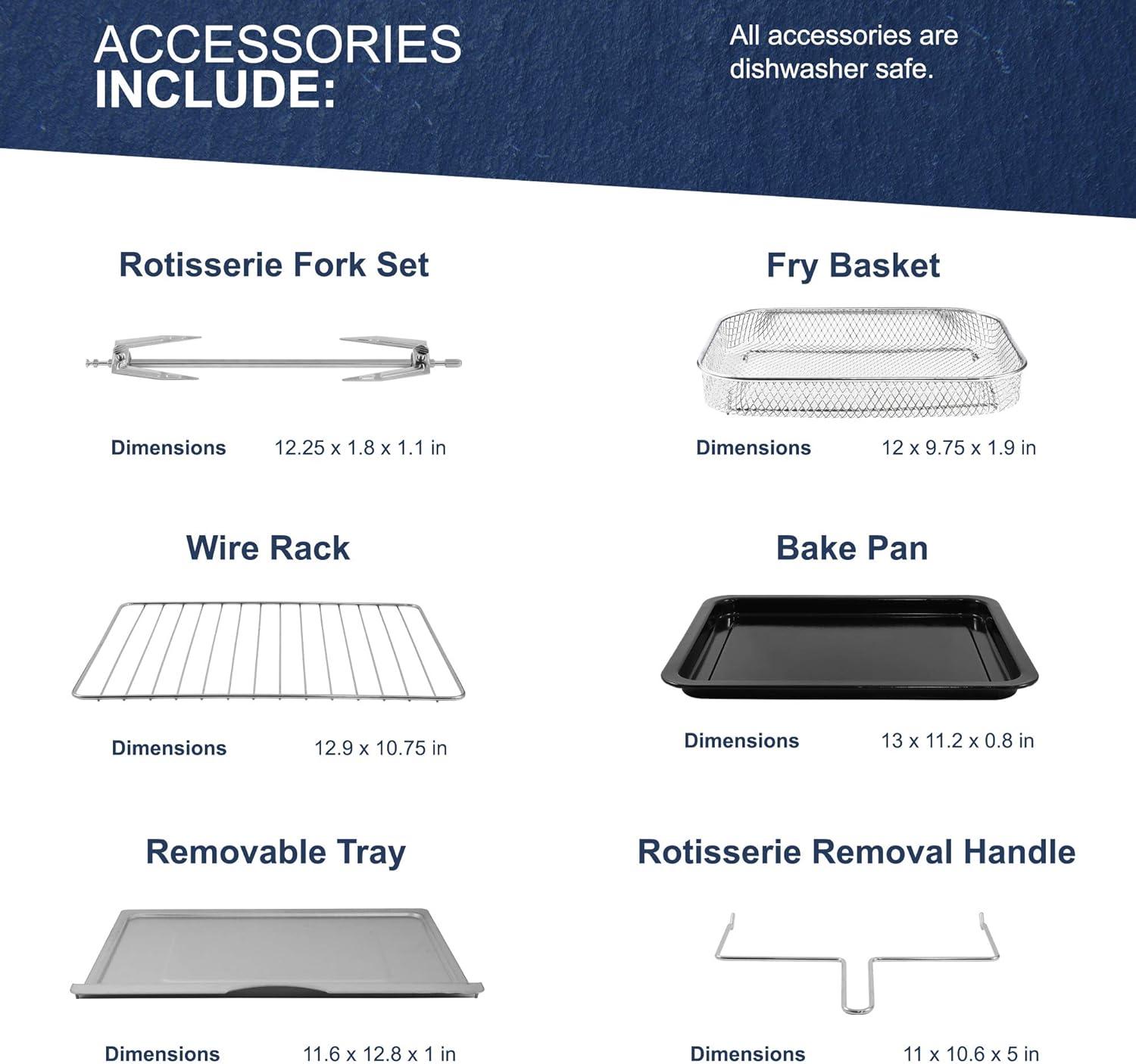 ETL APPROVED 1700-watt/120V Air fryer ideal for home kitchen use. Dishwasher safe removable non-stick coated bake pan, air fry basket, removable rack and rotisserie spit for fast, easy clean-up.