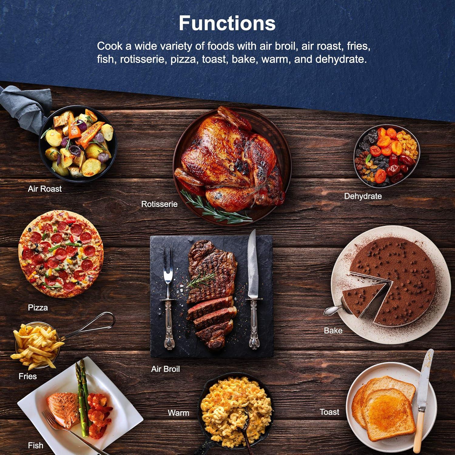 EX-LARGE CAPACITY: This beautiful & stylish convection air fryer oven has an extra large 24.5 Quart capacity and 10 preset functions, perfect for family-sized meals and XL cavity for 12” pizzas.