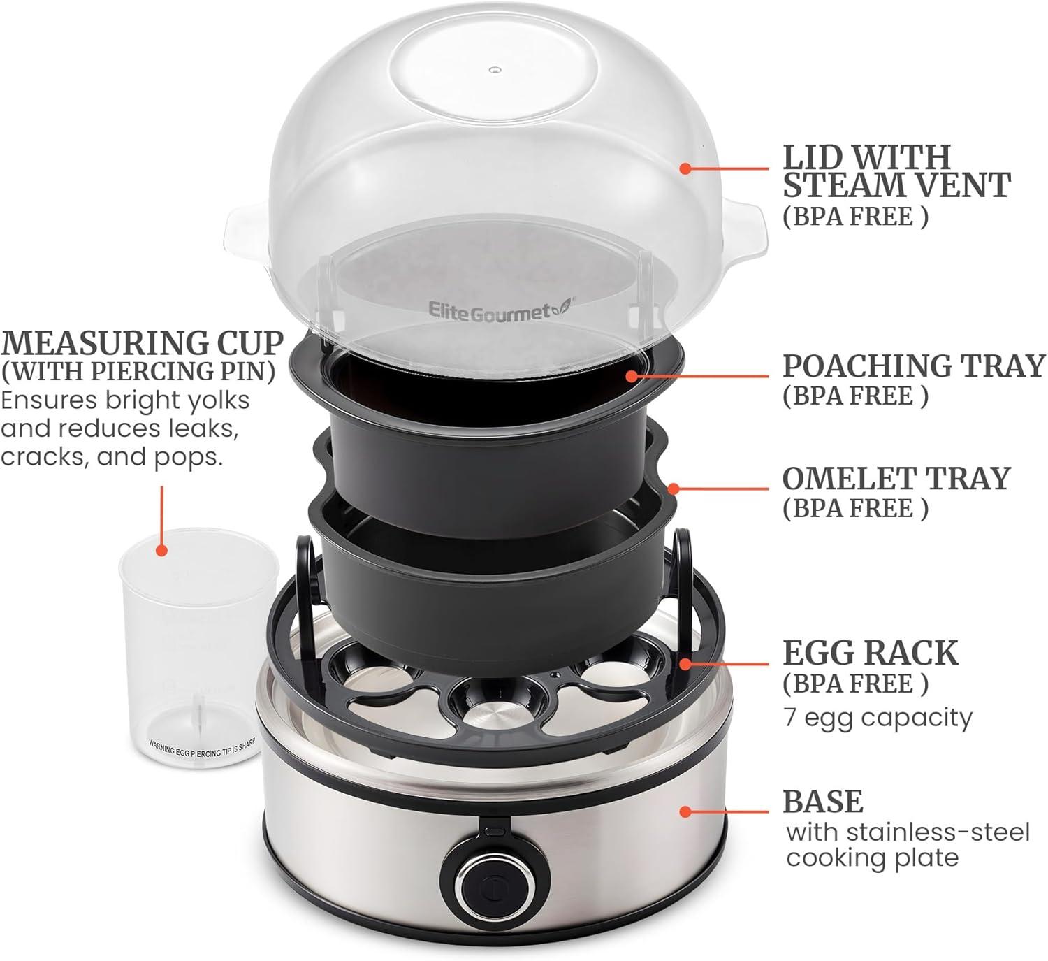 Elite Gourmet Easy Electric 7 Egg Capacity Cooker, Poacher, Omelet Maker, Scrambled, Soft, Medium, Hard Boiled with Auto Shut-Off and Buzzer, BPA Free(Stainless Steel)