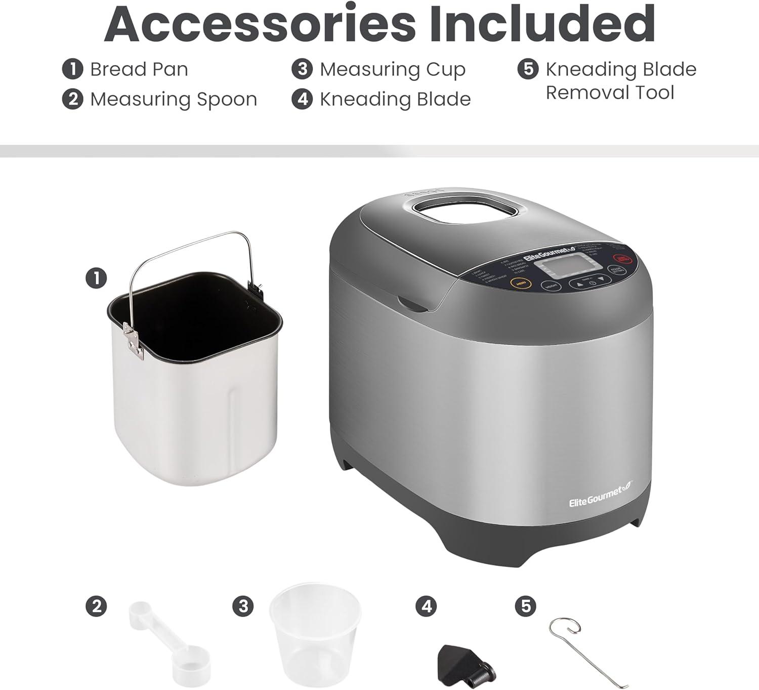 The Elite Gourmet 2-lb Digital Bread Maker with CERALAST™ ceramic coated bread pan & kneading blade takes the guesswork out of baking fresh, preservative-free bread at home. Designed for convenience and versatility, this all-in-one appliance makes it easy to enjoy homemade bread, dough, cake, jam, and even yogurt with minimal effort. The non-toxic, PFAS-free ceramic-coated pan ensures your food stays safe and is easy to clean. With 19 pre-set functions, you can make a wide range of recipes including basic white bread, sweet bread, gluten-free, whole wheat, rye, French bread, and rice bread. You can also prepare a variety of doughs for pizza, focaccia, wholemeal, or cinnamon rolls. Just add your ingredients, select the program, and press start—the machine handles the kneading, rising, and baking for you. Customize your baking with light, medium, or dark crust settings, and take advantage of the delay timer to wake up to the smell of freshly baked bread. Add your favorite nuts, seeds, or dried fruits for a unique twist. Once you’ve enjoyed your first homemade loaf, you’ll be inspired to experiment with more recipes, and before long, friends and family will be asking for your delicious creations. Complete with an instruction manual, helpful tips, and starter recipes, the Elite Gourmet bread maker is a true time- and money-saving appliance that brings bakery-quality results to your kitchen.