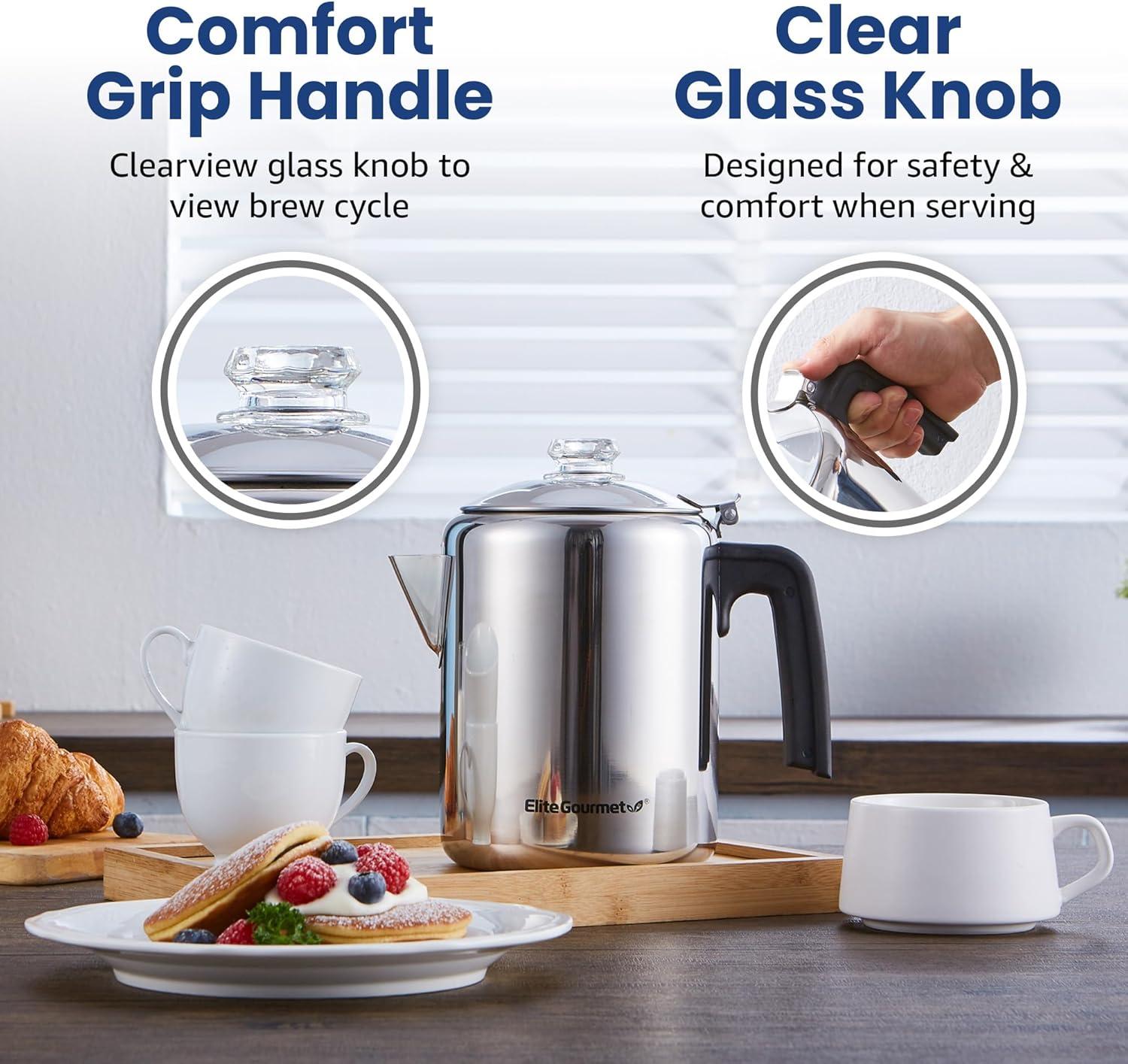 Brewing fresh coffee the old fashioned way has never been easier than with the Elite Gourmet 8 Cup Classic Stovetop Coffee & Tea Percolator. This beautiful percolator features a 304 food grade polished stainless steel finish, removable stainless steel filter, drip free pouring spout and a hinged lid with glass brewing progress knob. Brew up to 8 cups of rich, flavorful & delicious coffee or tea. It's the perfect addition to any home, office or to a camper's supplies. Durable and built for use on an indoor stovetop or outdoor camping fire making it perfect for travel. Quickly brew hot coffee in just minutes or heat water for your favorite tea, oatmeal, instant soup or noodles!