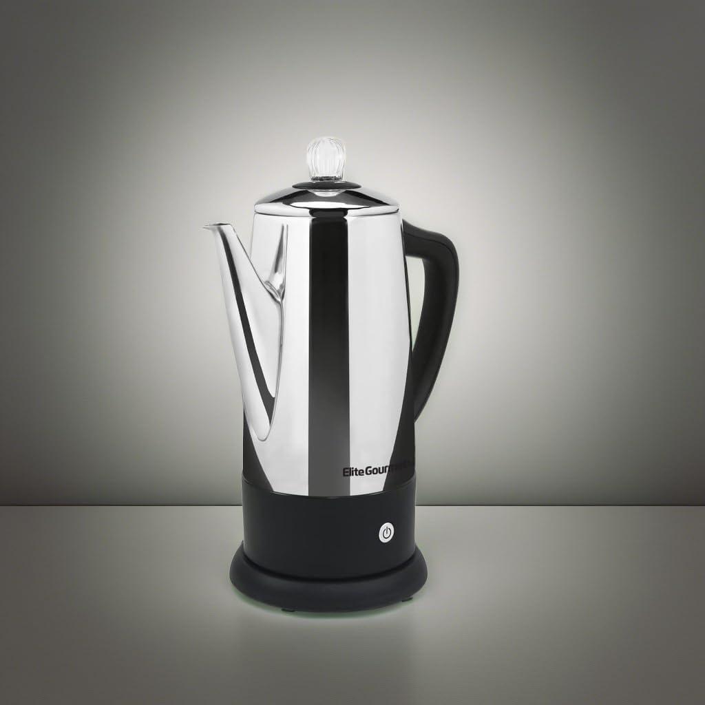 Brewing hot beverages the old fashioned way has never been easier with the Elite Platinum 12 Cup Automatic Tea & Coffee Percolator. This lightweight, portable unit brews up to 12 delicious cups of your favorite coffee or tea. It features an easy to wash removable stainless steel filter, power and ready indicator lights which let you know when your beverage is ready to be served, an automatic keep warm feature, and a comfort grip heat resistant handle making serving safe and easy. With a convenient 360° swivel base providing cord-free serving and stylish stainless steel finish. Boil dry safety feature. Transparent brew progress knob and classic precision pouring spout. Cord storage and non-slip feet for safety. This percolator makes the perfect addition to any home or office.