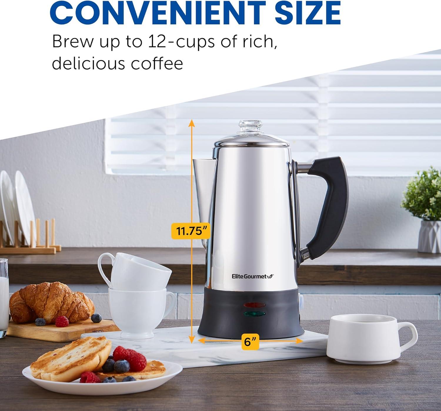 Enjoying rich full body flavor of hot coffee using the Classic percolating method has never been easier than with the Elite Gourmet 12 Cup Automatic Coffee & Tea Percolator. This Beautiful, Classic Design, lightweight percolator brews up to 12 cups of your favorite coffee or tea. Features include a glass brew progress knob, polished stainless steel body & lid with a drip free pouring spout, brushed stainless steel coffee filter, filter cover & brewing stem. The one-touch illuminated On/Off switch lets you know the percolator is brewing and automatically switches to keep warm (no more than 6 hours is recommended) once coffee is ready to serve. The comfort grip, cool-touch handle makes serving safe and easy. Perfectly designed for cord-free serving, just unplug, serve, then plug back in and the Percolator will resume the keep warm function. The Boil dry safety feature will detect the absence of water and automatically turn the percolator off to keep the unit from overheating. It’s Classic design and durablility make this percolator a perfect addition to any home or office.