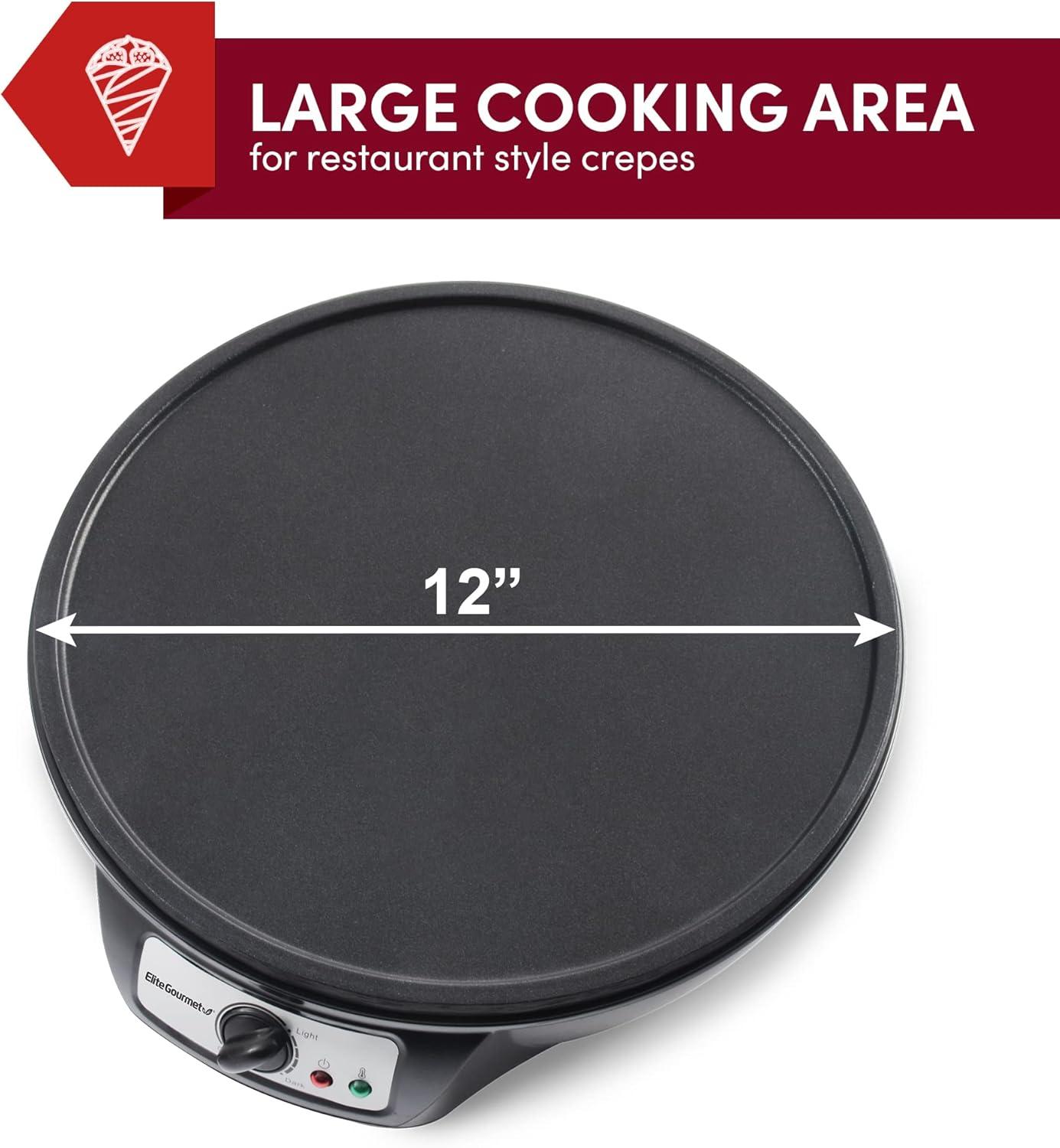 Making crepes is easy and fun with the Elite Gourmet easy Crepe maker! an non-stick 12″ griddle plate gives you plenty of room to play! 5 temperature settings and a batter spreader give you the precise control to make perfect crepes. The griddle surface is so versatile it can also be used to prepare a wide variety of breakfast foods such as pancakes, eggs and bacon! includes a recipe book with fun recipes for you to enjoy with friends and/or family. Safety features include an on/off ready light and rubber feet for added stability.