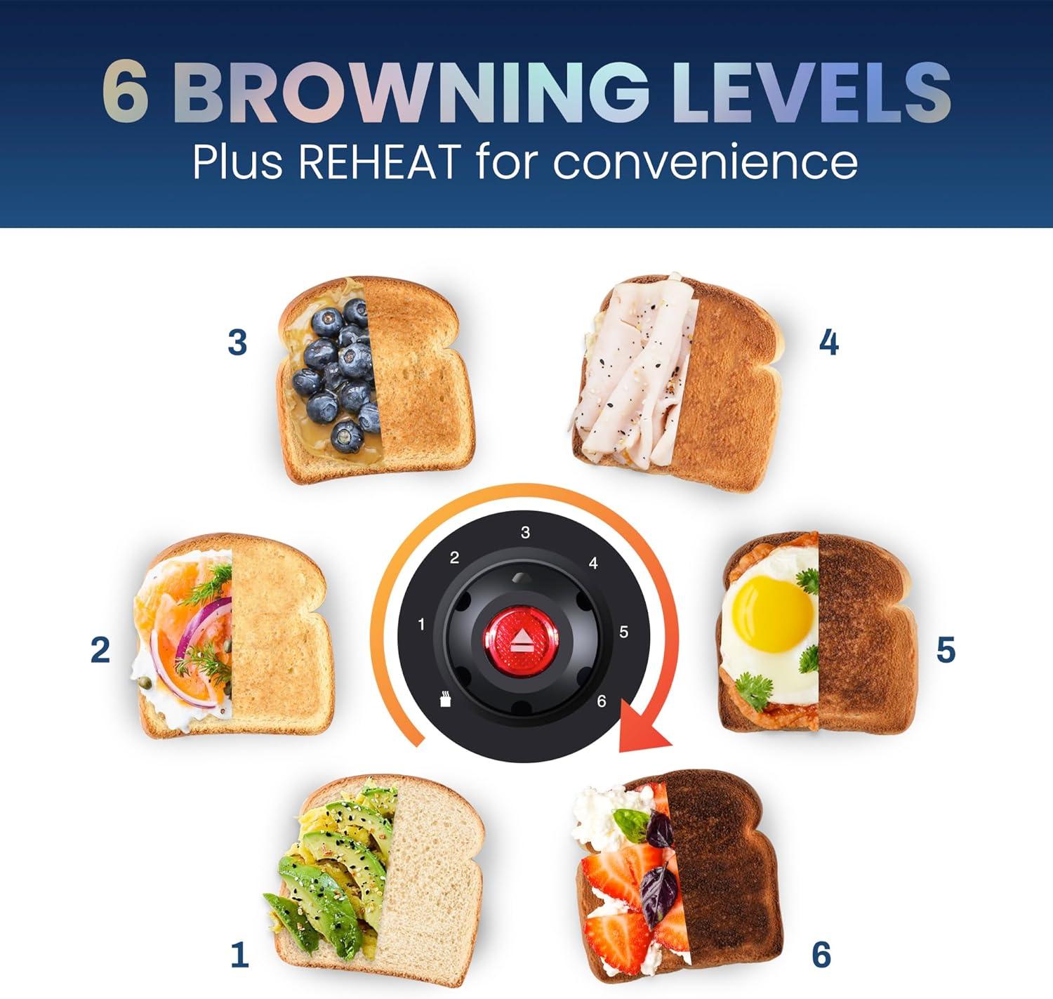 2 EXTRA WIDE 1.25″ TOASTING SLOTS to fit up to 4 extra thick slices of bread products such as Texas Toast, bagels and specialty breads.