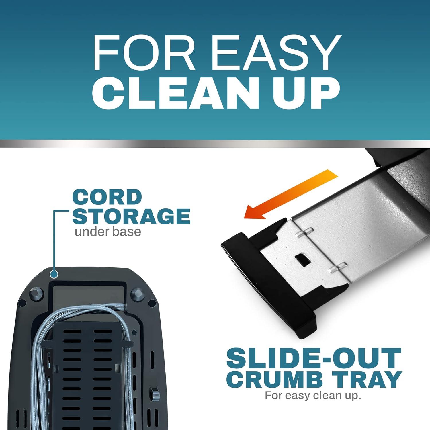 Slide-Out Crumb Tray – Cleaning up crumbs or mess after multiple uses is easy thanks to a simple slide out tray that lets you empty it out and wipe it down by hand.