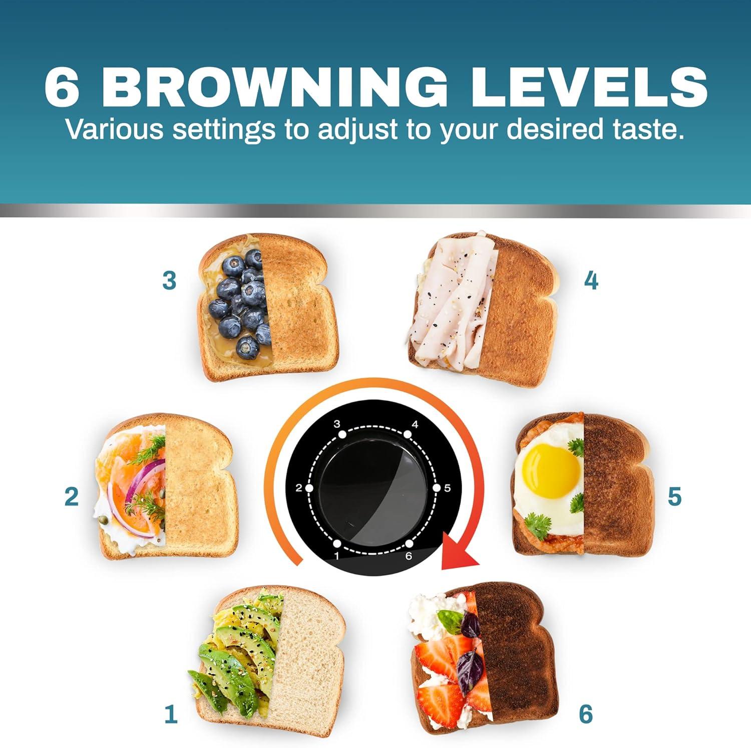Quick Adjust Toaster Settings – This premium kitchen toaster features 6 variable toast shade settings to let you create light, medium, or crispy bread in minutes.