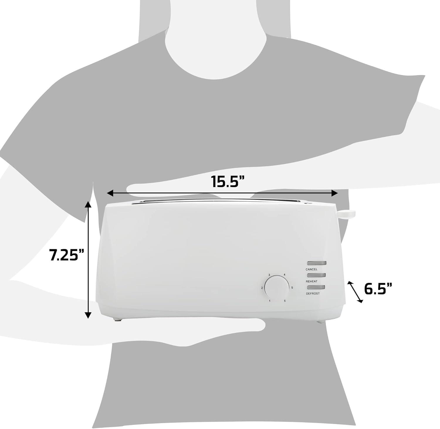 Elite Gourmet Long Slot 4 Slice Toaster is a beautiful addition to any kitchen. Enjoy a wide variety of your favorite breads with the large toasting slots which can accommodate longer, rectangular slices of bread such as sourdough or other artisanal loafs. It features 6 variable toast shade settings as well as Cancel, Defrost, and Reheat functions all encased in a sleek, cool-touch housing. The extra-long space saving design easily fits 4 slices of toast while not cluttering your countertop.