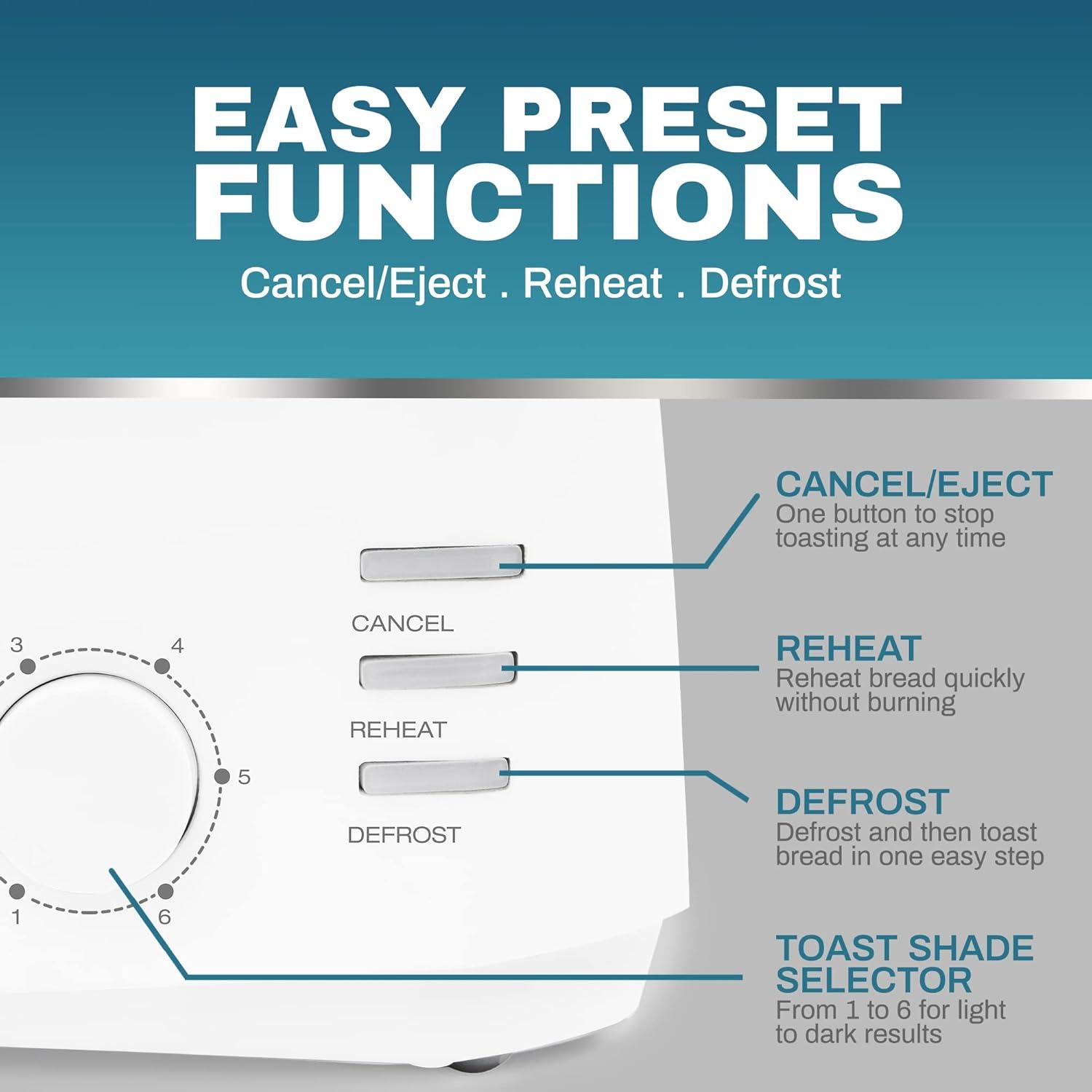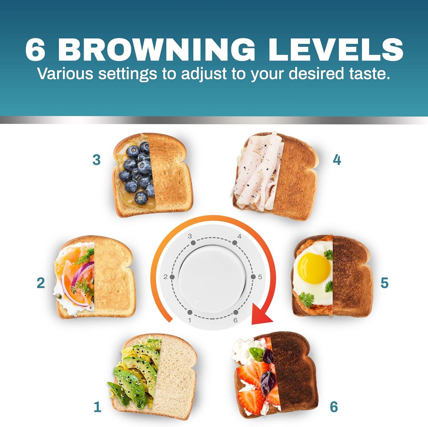 Quick Adjust Toaster Settings – This premium kitchen toaster features 6 variable toast shade settings to let you create light, medium, or crispy bread in minutes.