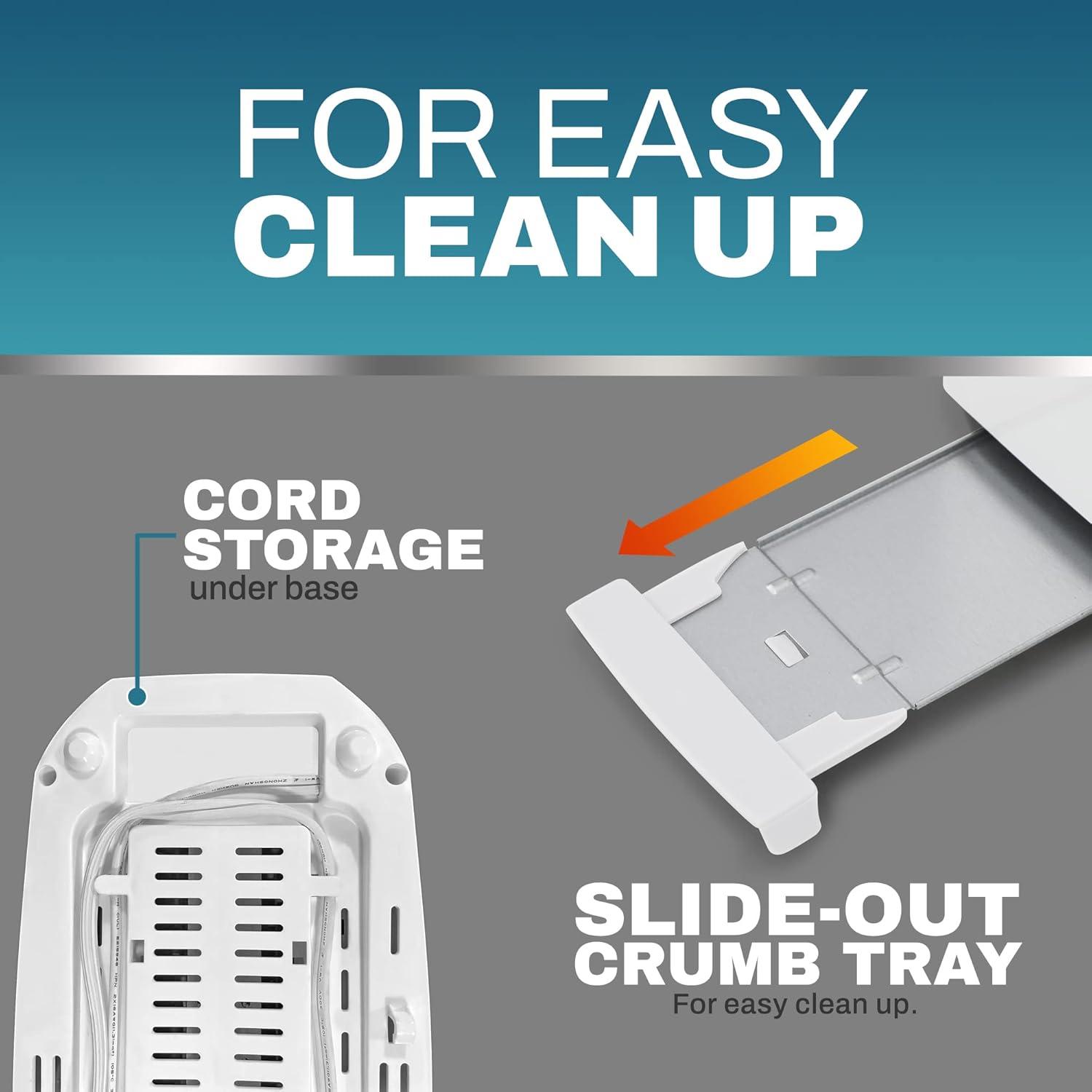Slide-Out Crumb Tray – Cleaning up crumbs or mess after multiple uses is easy thanks to a simple slide out tray that lets you empty it out and wipe it down by hand.