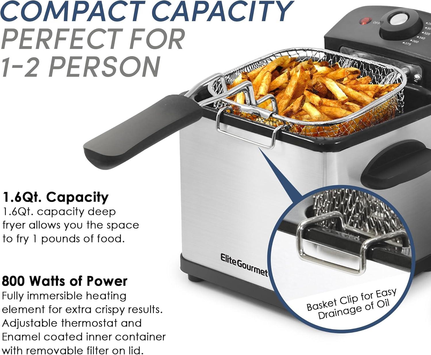 Enjoy all of your favorite foods with the Elite Gourmet 1.6Qt Deep Fryer. With its beautiful brushed stainless steel exterior, this deep fryer is an absolute necessity to any modern home kitchen. It features a thermostat knob that heats up to 375°F so you can cook anything from French fries to fried zucchini or from buffalo wings to onion rings. It's 1.6-quart. allows you to cook up to 4.5lb. of food per batch. Emel non-stick removable inner container that is full immersible. Vented cool-touch lid for added safety. Separate power and ready indicator lights to let you know when oil is ready. Also includes a replaceable filter to elimite unwanted grease and oil odors. EASY TO CLEAN: The fry basket with resting hook provides easy draige of excess oil from food. The heating element easily removes for cleaning. The lid, fry basket and oil pan are dishwasher safe. US-BASED Customer Support Team lets you buy with confidence. Maxi-Matic has been providing quality products for over 35 years, send us a message or call our Toll-Free number in the instruction manual and a Customer Care Rep will respond within 1 business day.