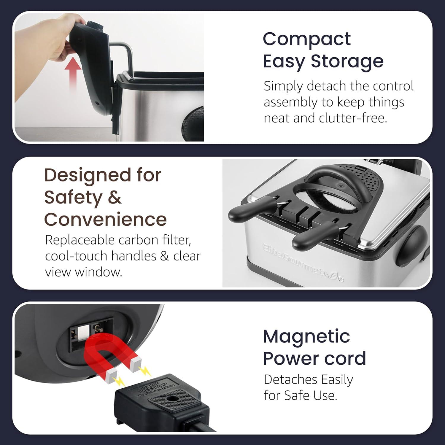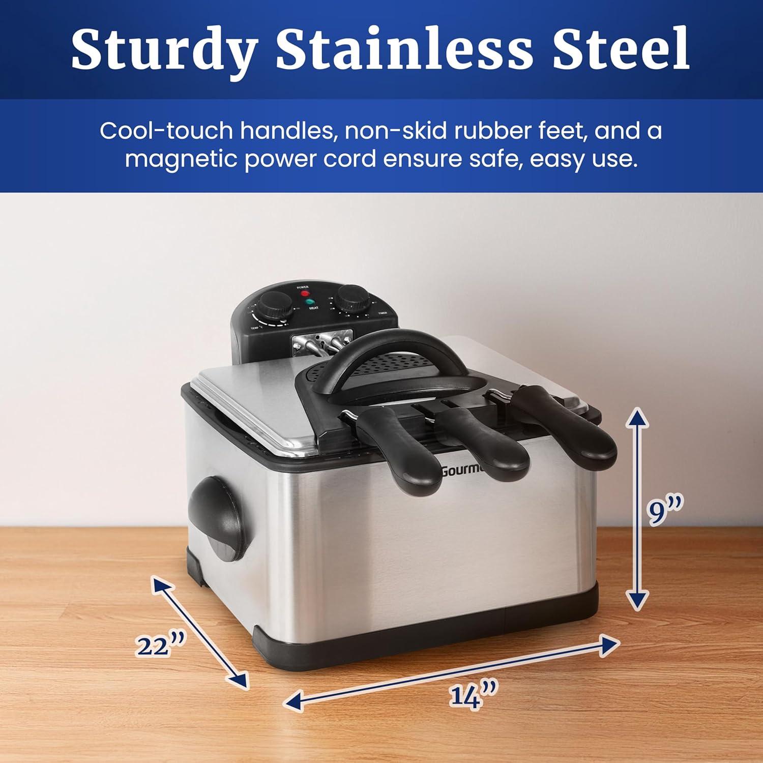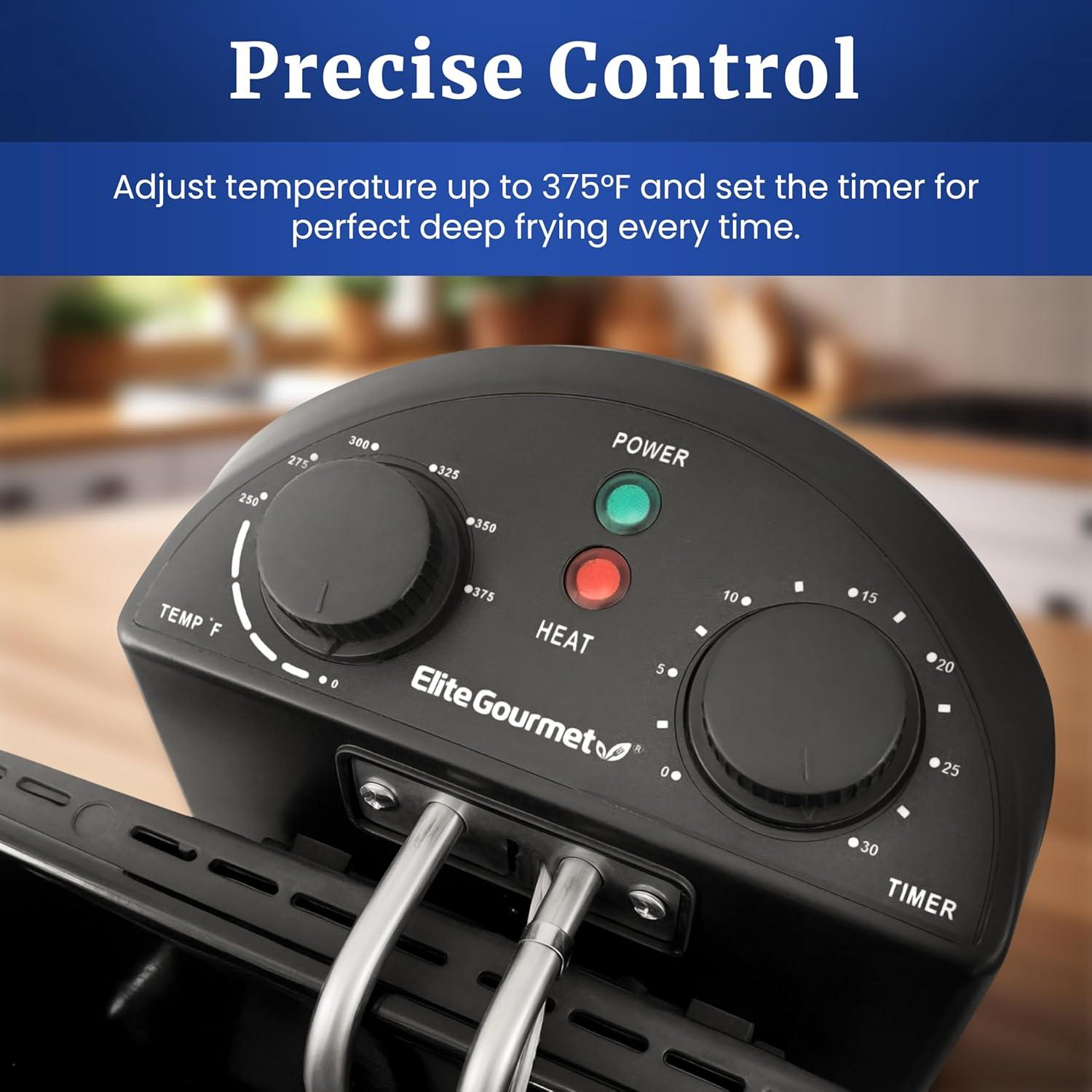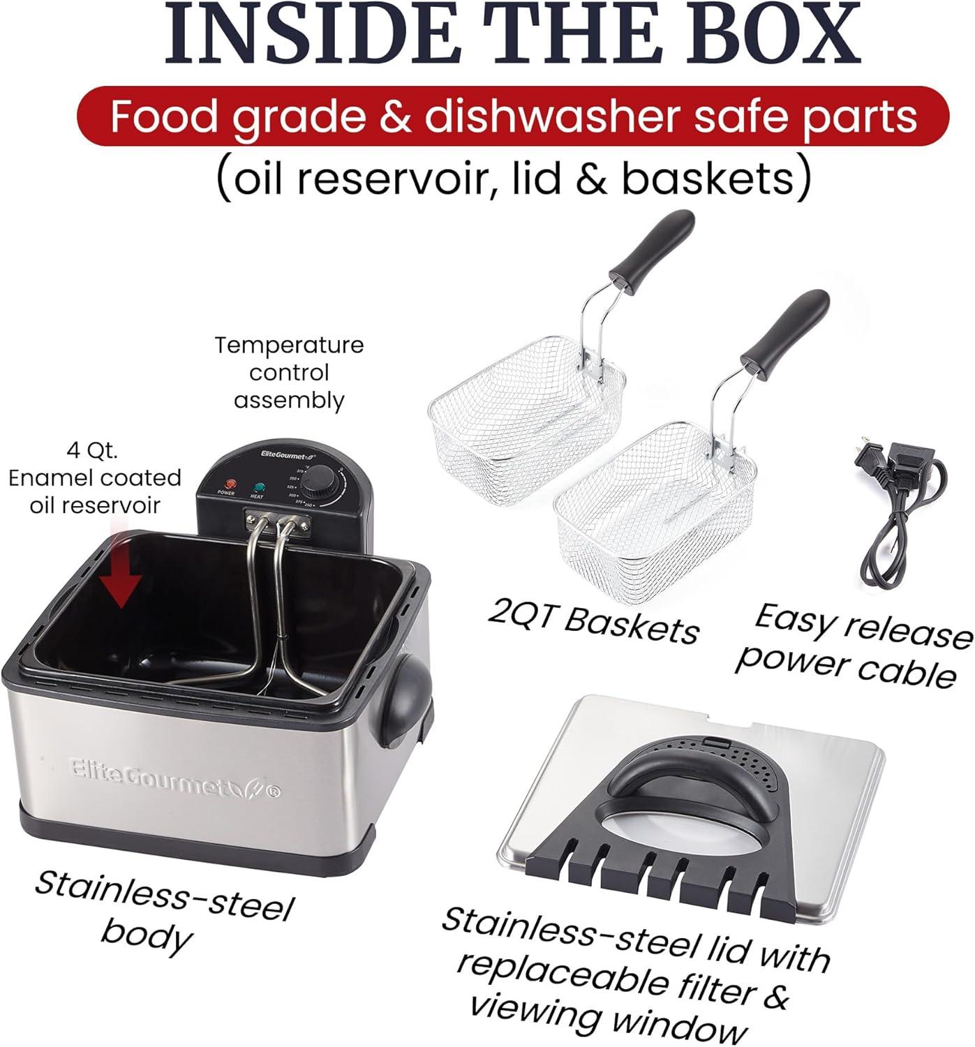 Elite Gourmet EDF-401TX 1700-Watt stainless-steel triple basket electric deep fryer with timer and free odor filter, 4.2L/18-cup. Double up on your favorite fried foods cooked with the Elite platinum 4Qt. Dual basket deep fryer. Attractively housed in a brushed Stainless Steel exterior, the dual baskets allow you to fry two foods at once for a deliciously tasty snack or use the bonus extra large basket to create an entire meal at once! Save time and cook up to 2 lb. Of food in each basket. Fry up some of your usual favorites such as fries and onion rings or even try something more bizarre such as deep fried Oregon's or pickles! The extra large 4Qt enamel container holds up to 18 Cups of oil
