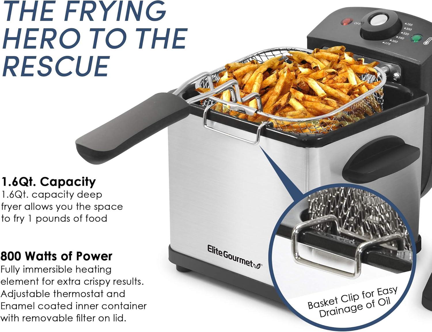 Elite Gourmet EDF1607# 800-Watt Mesh Basket 1.6 Quart / 6.5 Cup Oil Capacity, Electric Immersion Deep Fryer with Temperature Knob and Lid with View Window, stainless steel(1.6 Quart / 6.5 Cup)