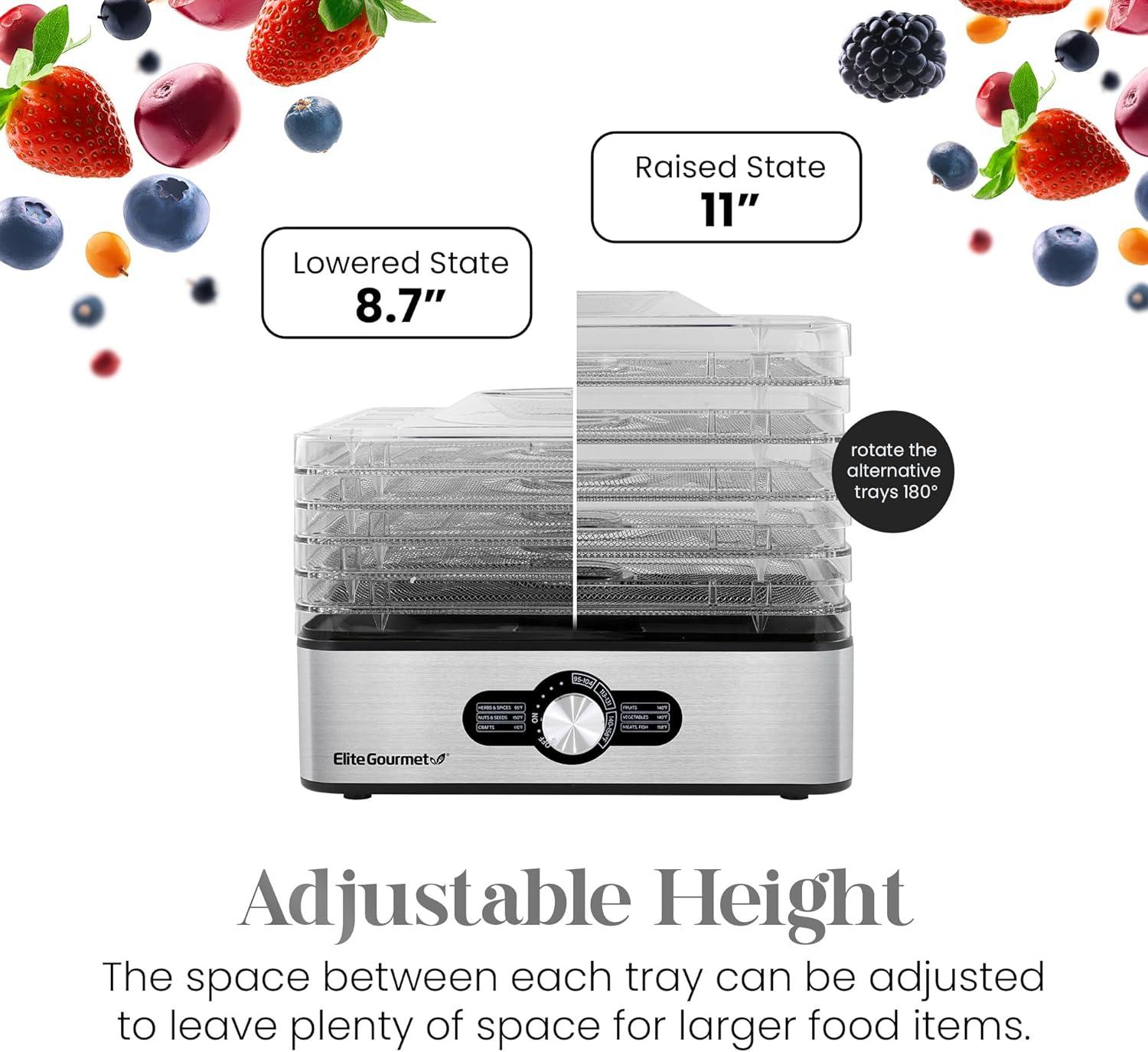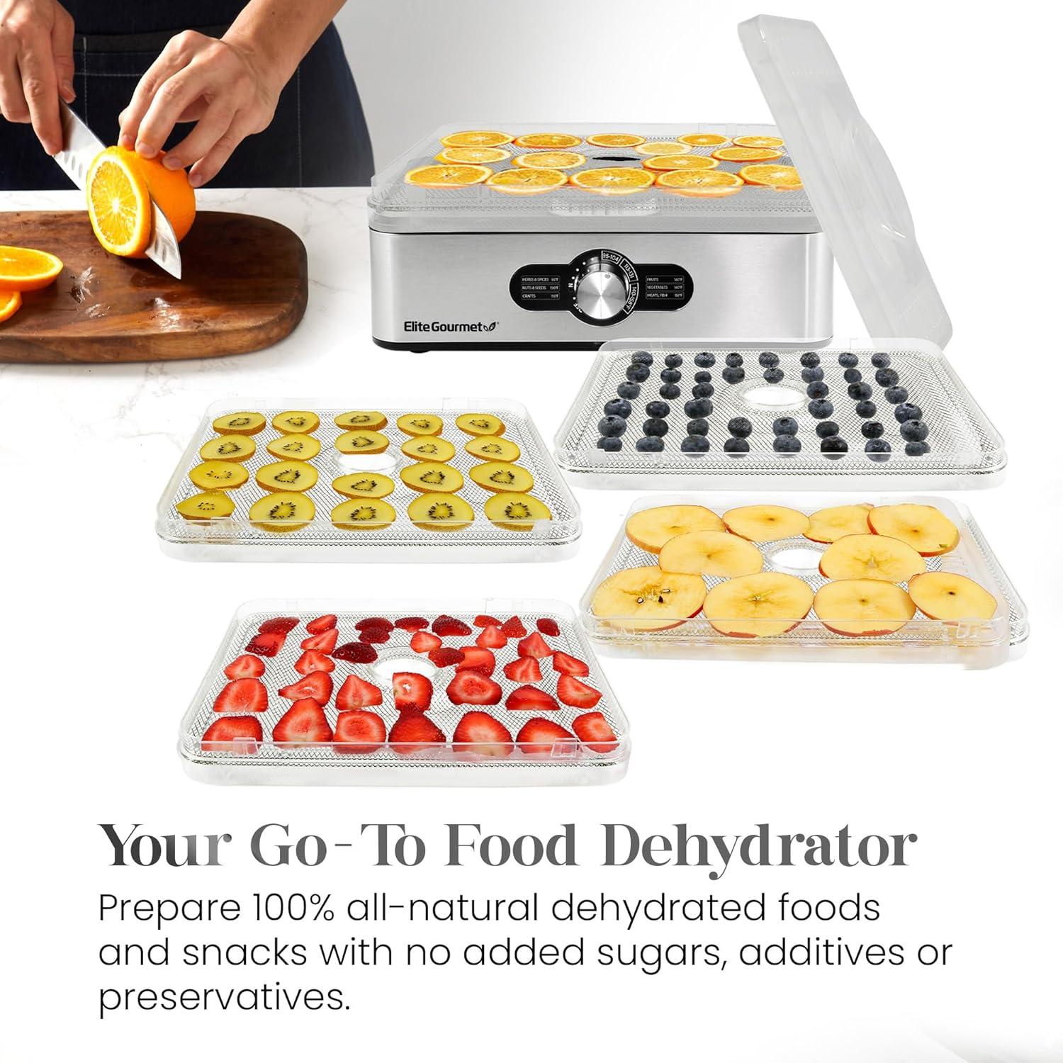 The Elite Gourmet 5-tray food dehydrator is a perfect option for snacks that are nutritional and low in calories. With five stackable drying trays with stainless steel bottoms and 240 watts of power, it’s easy to dry a variety of fruits and vegetables, and even make beef jerky! The continuous vertical airflow feature provides even drying, eliminating the need to rotate trays. This dehydrator includes an adjustable thermometer for better performance. Use the stackable and interchangeable stainless steel mesh trays to dry herbs and spices year-round enjoyment. Enjoy wholesome, home-made snacks for the entire family.