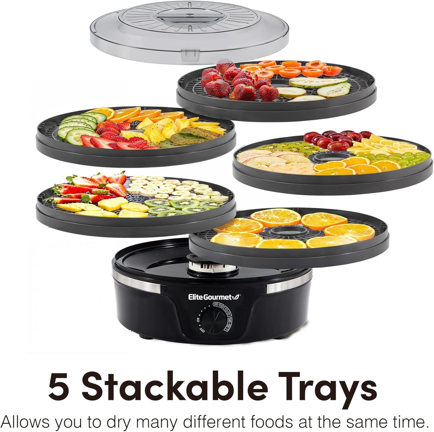 Elite Gourmet EFD809D Food Dehydrator with 5 Stainless Steel Trays, Adjustable Temp & Time + Keep Warm, Includes Interior Light, Fruit Roll Tray and Recipe Booklet, Black(Black)