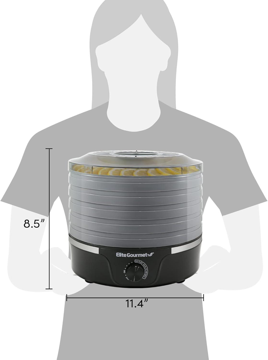 Elite Gourmet EFD809D Food Dehydrator with 5 Stainless Steel Trays, Adjustable Temp & Time + Keep Warm, Includes Interior Light, Fruit Roll Tray and Recipe Booklet, Black(Black and Gray)