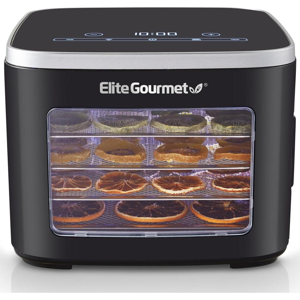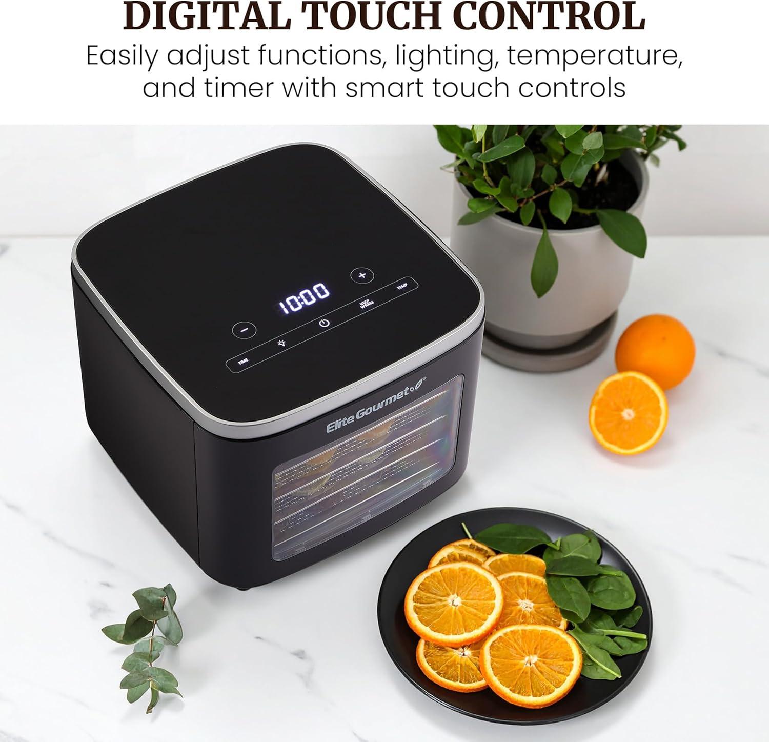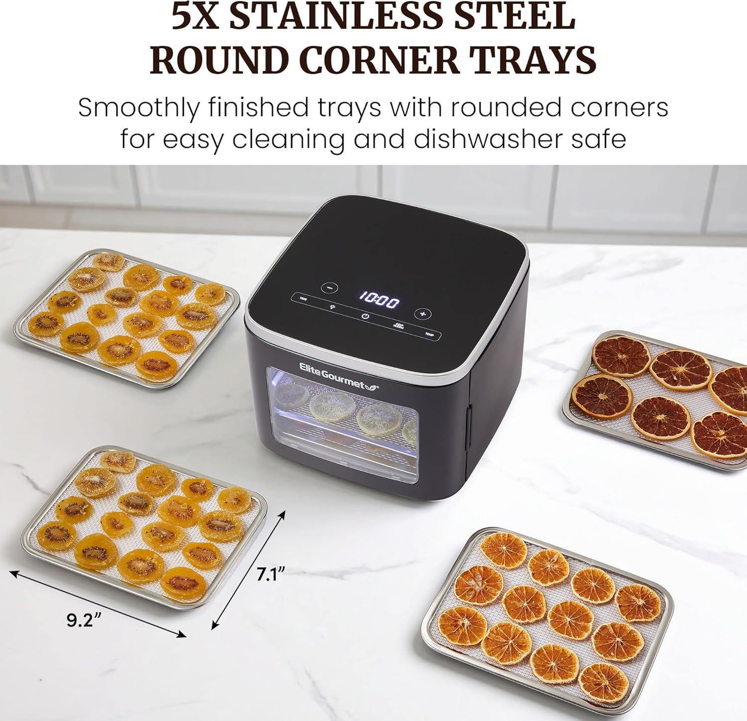 Create healthy, homemade snacks with ease using the Elite Gourmet EFD809D digital food dehydrator. Designed for even heat distribution and whisper-quiet operation, it features five spacious stainless steel trays with dense mesh for drying everything from herbs and fruit to jerky and nuts. The intuitive digital control panel offers precise temperature settings from 95°F to 194°F and a timer up to 48 hours, giving you full control over every batch. A built-in interior light lets you check progress without opening the door, while the keep warm function maintains ideal conditions after drying ends. Includes a fruit roll tray and a separate recipe booklet to help you get started right away.
