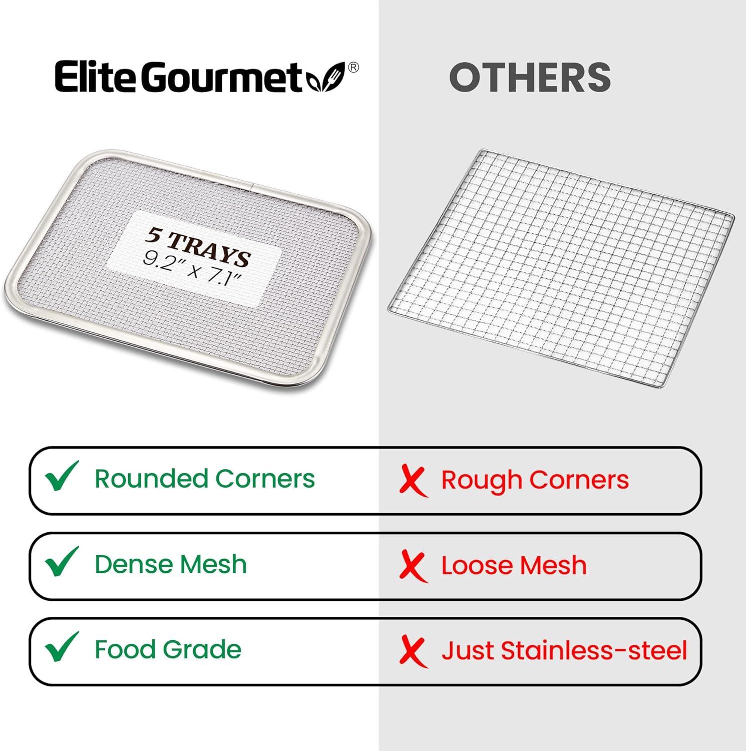Spacious Stainless Steel Trays with Mesh Design: Includes five stainless steel trays, each measuring 9.2 x 7.1 inches with smooth, rounded corners for easier cleaning. The dense mesh pattern is ideal for drying smaller foods like herbs, nuts, or berries without falling through—maximizing surface area for efficient dehydration across all five levels.