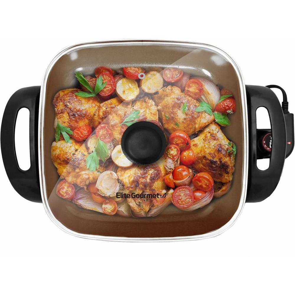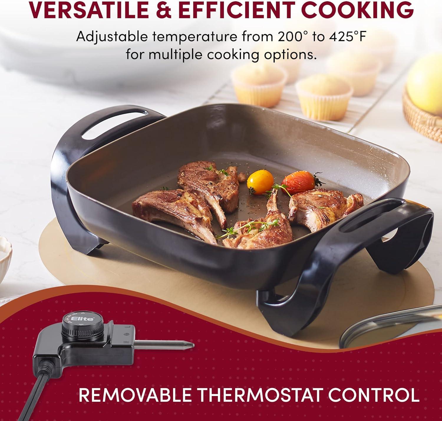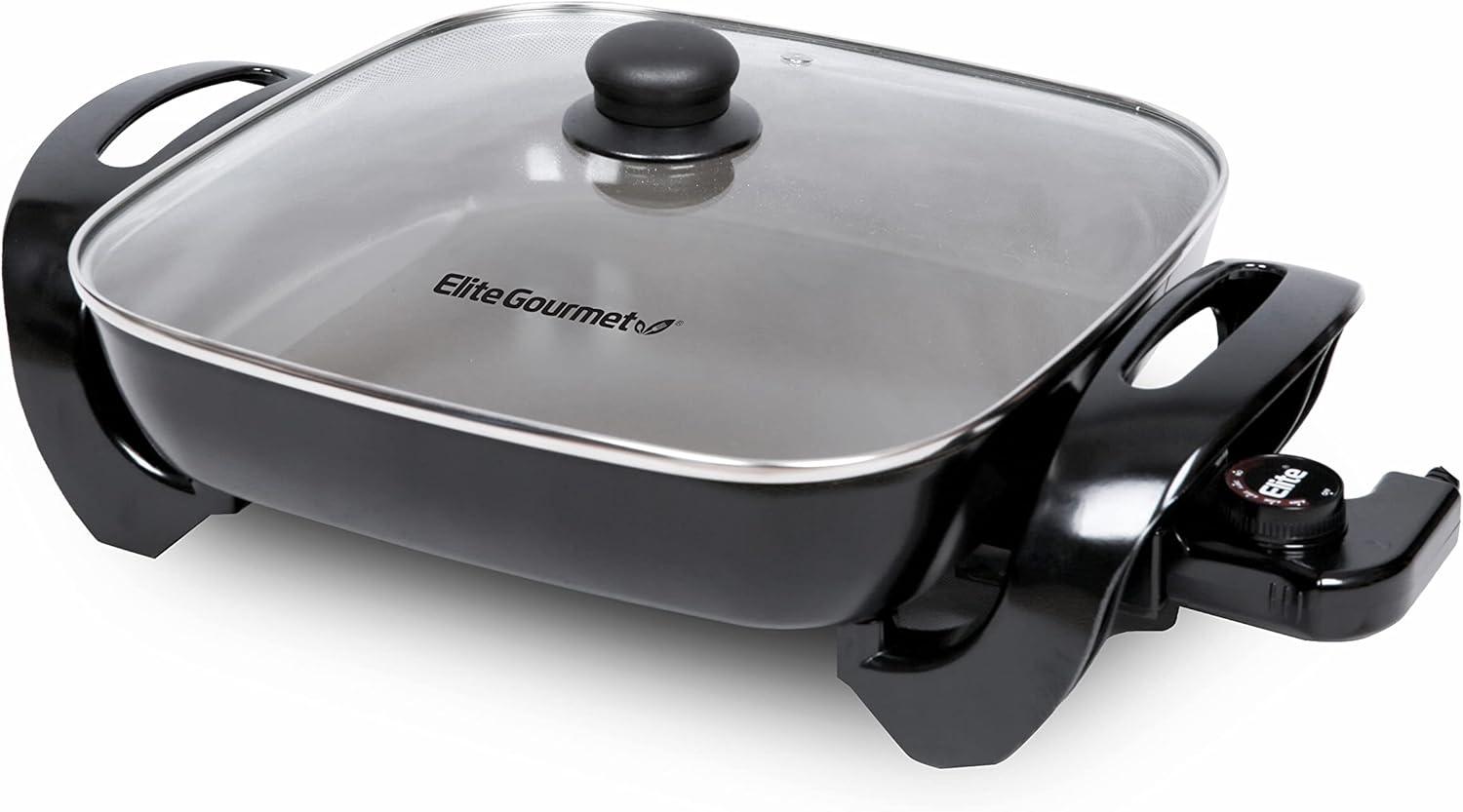 The Elite Gourmet 12”x 12” Titanium-Ceramic Non-stick Electric Skillet is one of the most versatile and convenient small kitchen appliances you can own. Prepare a variety of tasty meals in minutes and without using multiple pots, pans or appliances. With a durable Titanium Ceramic cooking surface and cast-in heating element, clean-up of our fully immersible skillet is easy (upon removal of the temperature control). Cook and serve up sumptuous meats, vegetables, soups, chili, stir-fry, desserts and many more foods for your entire family & friends. The Electric Skillet features a variable-temperature dial with a 200-425°F degree range, as well as an indicator light to let you know when power is on and desired temperature is achieved. Tall sides and a glass lid keep moisture in and protect against splatters as you monitor cooking. With its cool-touch handles you can safely tip the skillet to drain juices for soups and gravy. The Elite Gourmet 12″ Ceramic Titanium Coated Electric Skillet lets you prepare meals without heating up the entire kitchen making it one of the most cost-effective of kitchen accessories.
