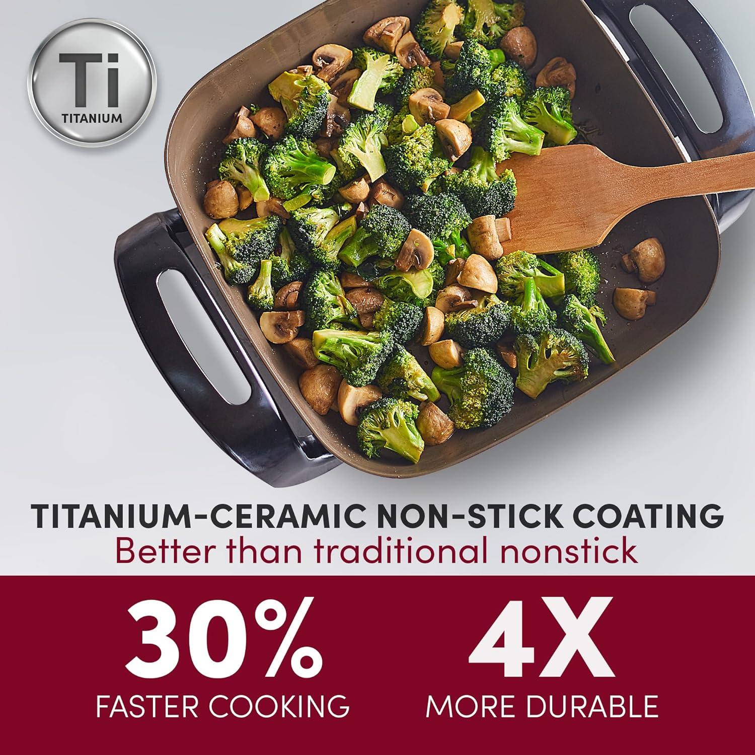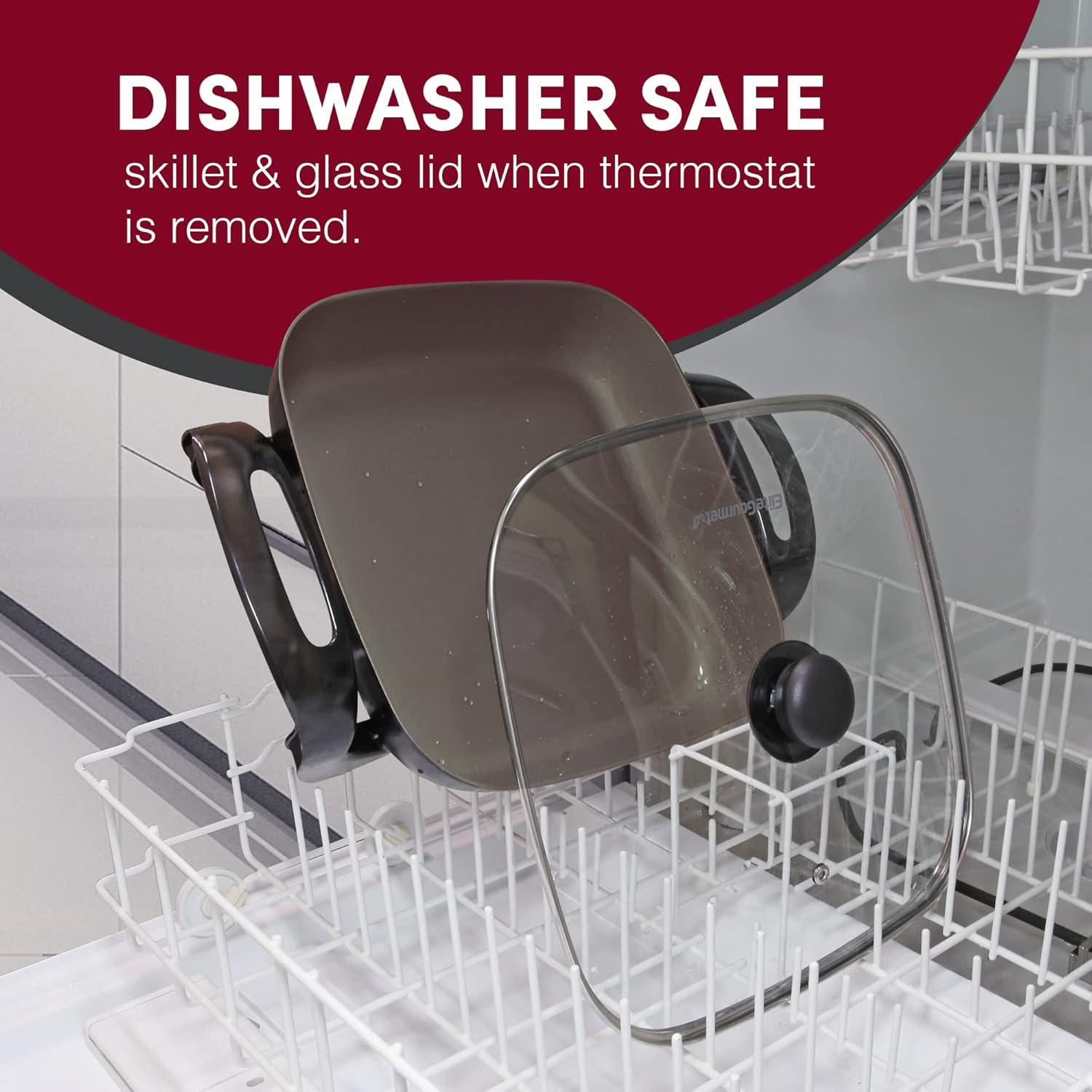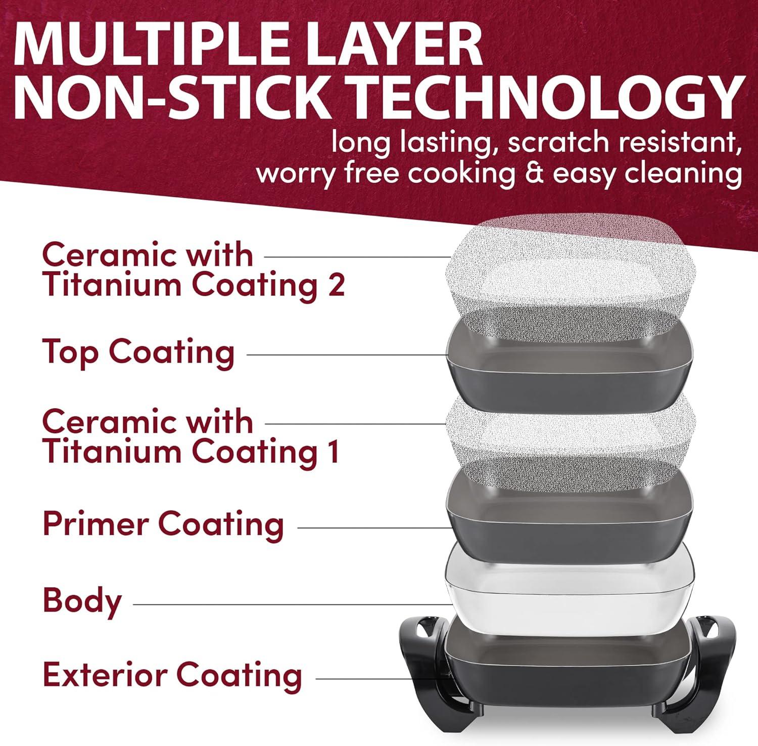 The Elite Gourmet 12”x 12” Titanium-Ceramic Non-stick Electric Skillet is one of the most versatile and convenient small kitchen appliances you can own. Prepare a variety of tasty meals in minutes and without using multiple pots, pans or appliances. With a durable Titanium Ceramic cooking surface and cast-in heating element, clean-up of our fully immersible skillet is easy (upon removal of the temperature control). Cook and serve up sumptuous meats, vegetables, soups, chili, stir-fry, desserts and many more foods for your entire family & friends. The Electric Skillet features a variable-temperature dial with a 200-425°F degree range, as well as an indicator light to let you know when power is on and desired temperature is achieved. Tall sides and a glass lid keep moisture in and protect against splatters as you monitor cooking. With its cool-touch handles you can safely tip the skillet to drain juices for soups and gravy. The Elite Gourmet 12″ Ceramic Titanium Coated Electric Skillet lets you prepare meals without heating up the entire kitchen making it one of the most cost-effective of kitchen accessories.