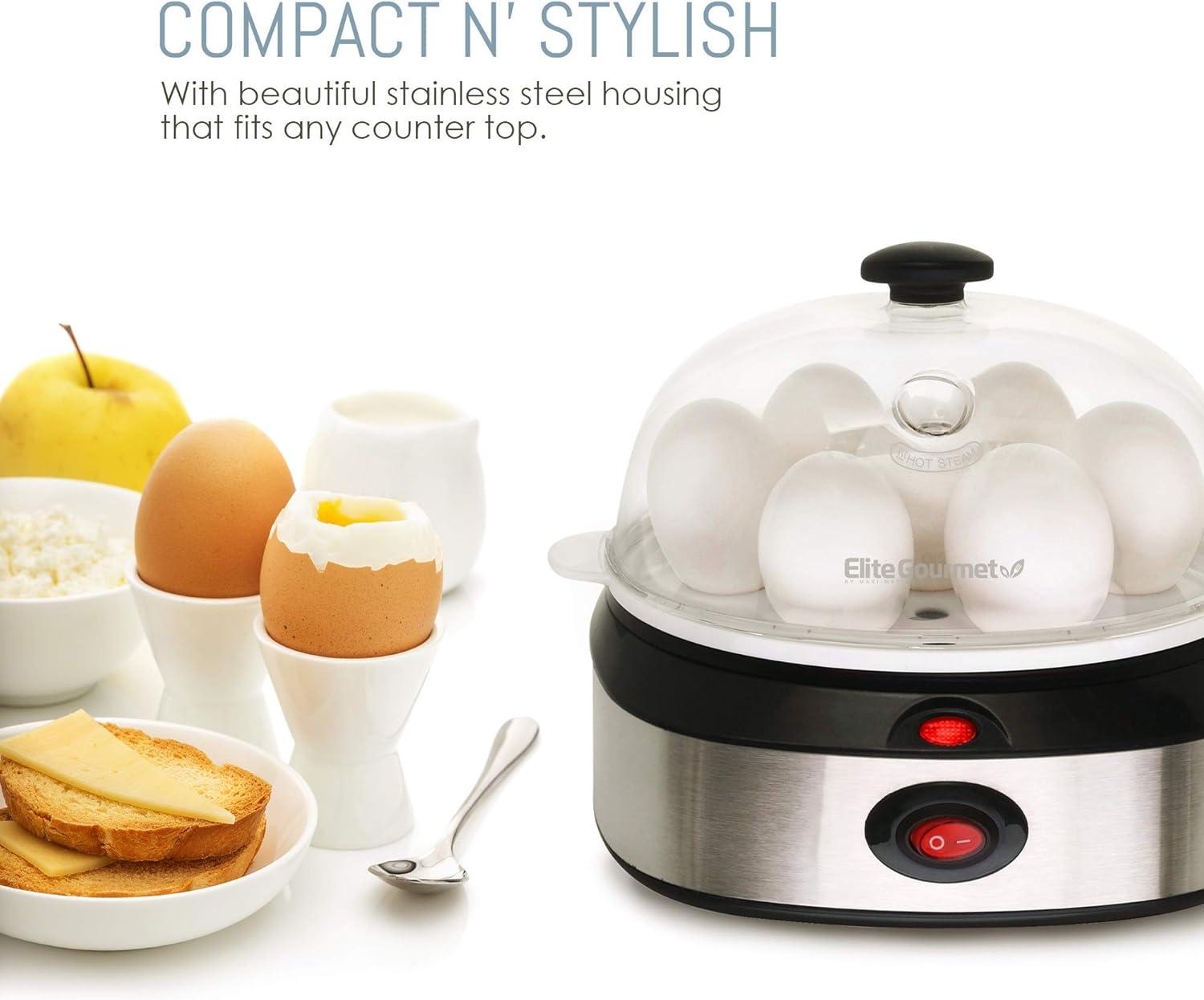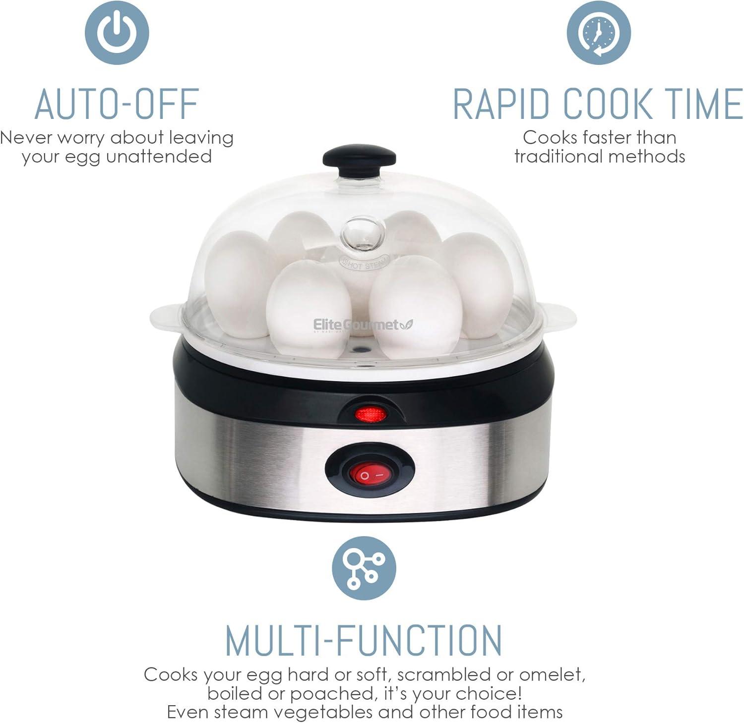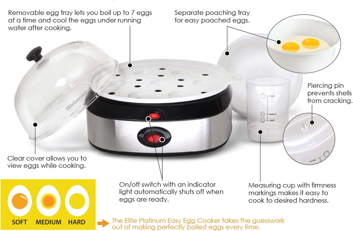 The automatic stainless easy egg cooker allows you to cook up to 7 eggs at one time. An included measuring cup allows you to calibrate the water level to consistently prepare the eggs to your desired style; soft, medium, or hard boiled. In addition to steaming, this egg cooker allows you to gently poach two eggs with the included poaching tray. A convenient automatic shut-off indicator light lets the user know exactly when the cooking cycle is complete. The built-in timer adjusts automatically from soft to hard and cooks eggs exactly to your liking! Also included is a measuring cup with a built-in piercing pin to prevent cracked shells during cooking. It also allows you to pierce the eggs prior to cooking to release the sulfur within the egg. The result is consistently perfect golden yellow yolks. Gone are the days of undercooking or overcooking your eggs!