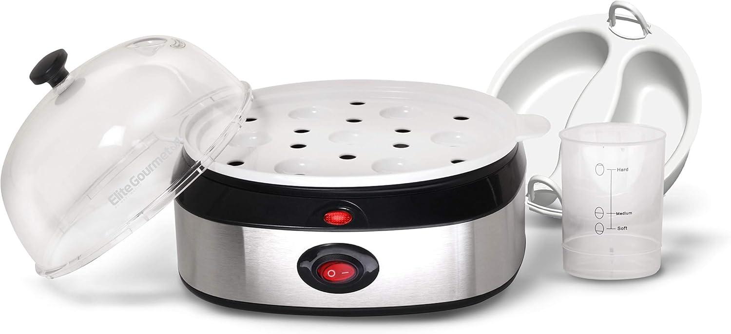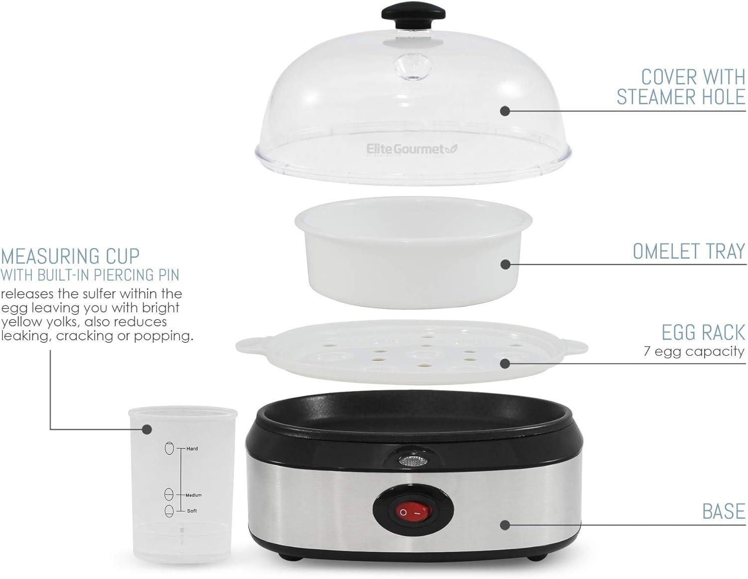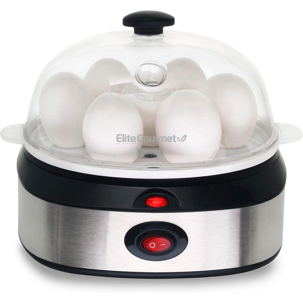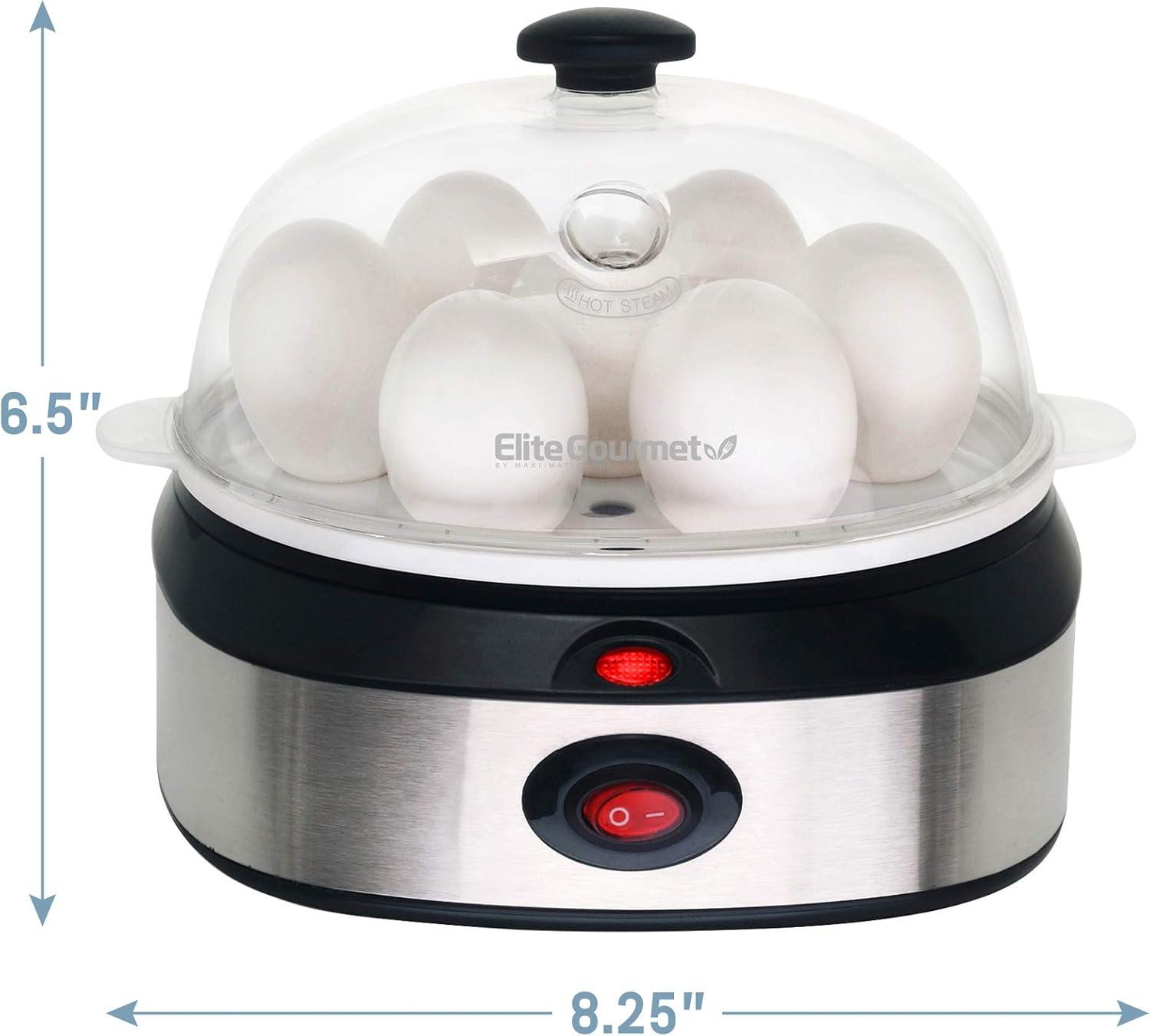 The automatic stainless easy egg cooker allows you to cook up to 7 eggs at one time. An included measuring cup allows you to calibrate the water level to consistently prepare the eggs to your desired style; soft, medium, or hard boiled. In addition to steaming, this egg cooker allows you to gently poach two eggs with the included poaching tray. A convenient automatic shut-off indicator light lets the user know exactly when the cooking cycle is complete. The built-in timer adjusts automatically from soft to hard and cooks eggs exactly to your liking! Also included is a measuring cup with a built-in piercing pin to prevent cracked shells during cooking. It also allows you to pierce the eggs prior to cooking to release the sulfur within the egg. The result is consistently perfect golden yellow yolks. Gone are the days of undercooking or overcooking your eggs!