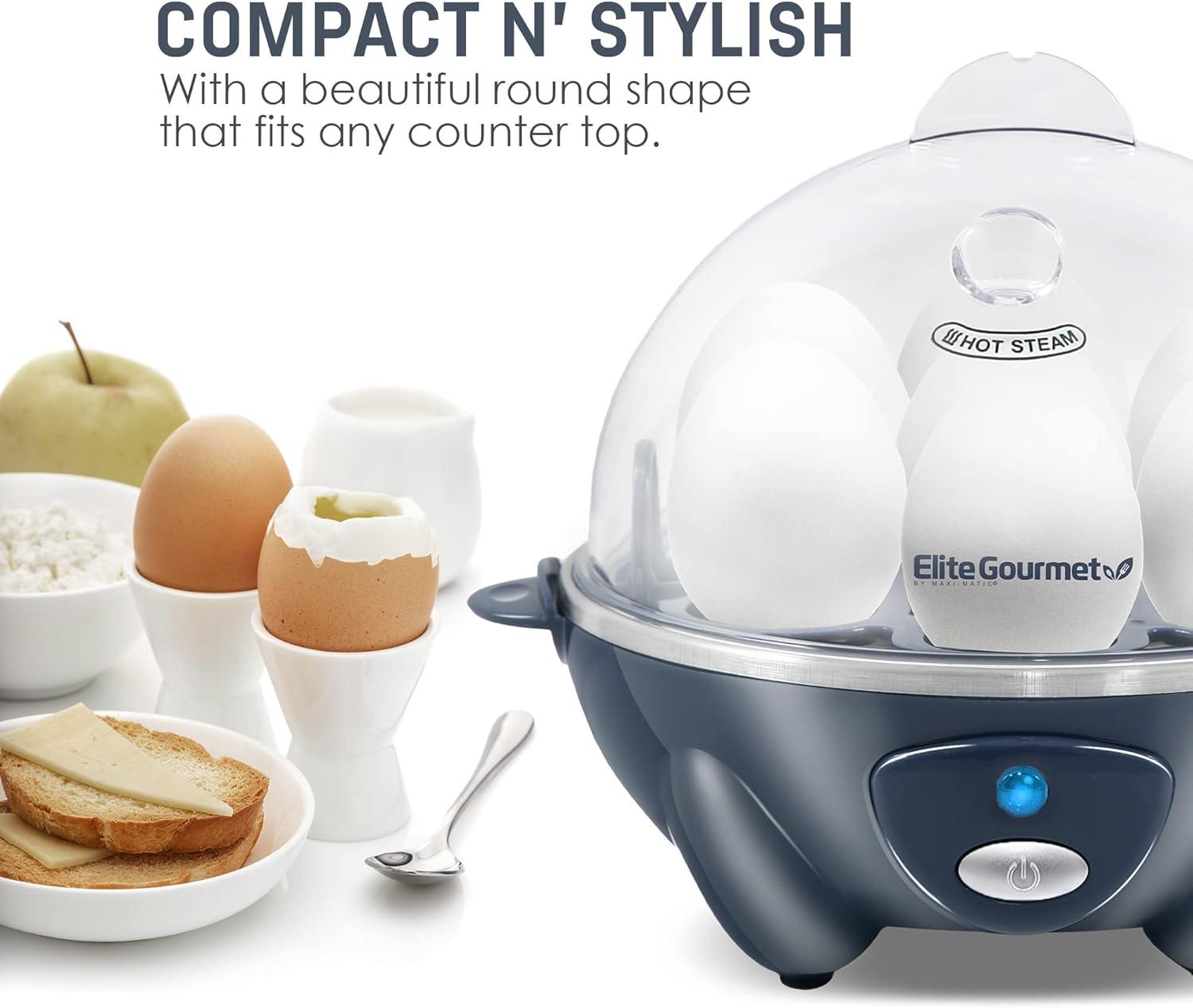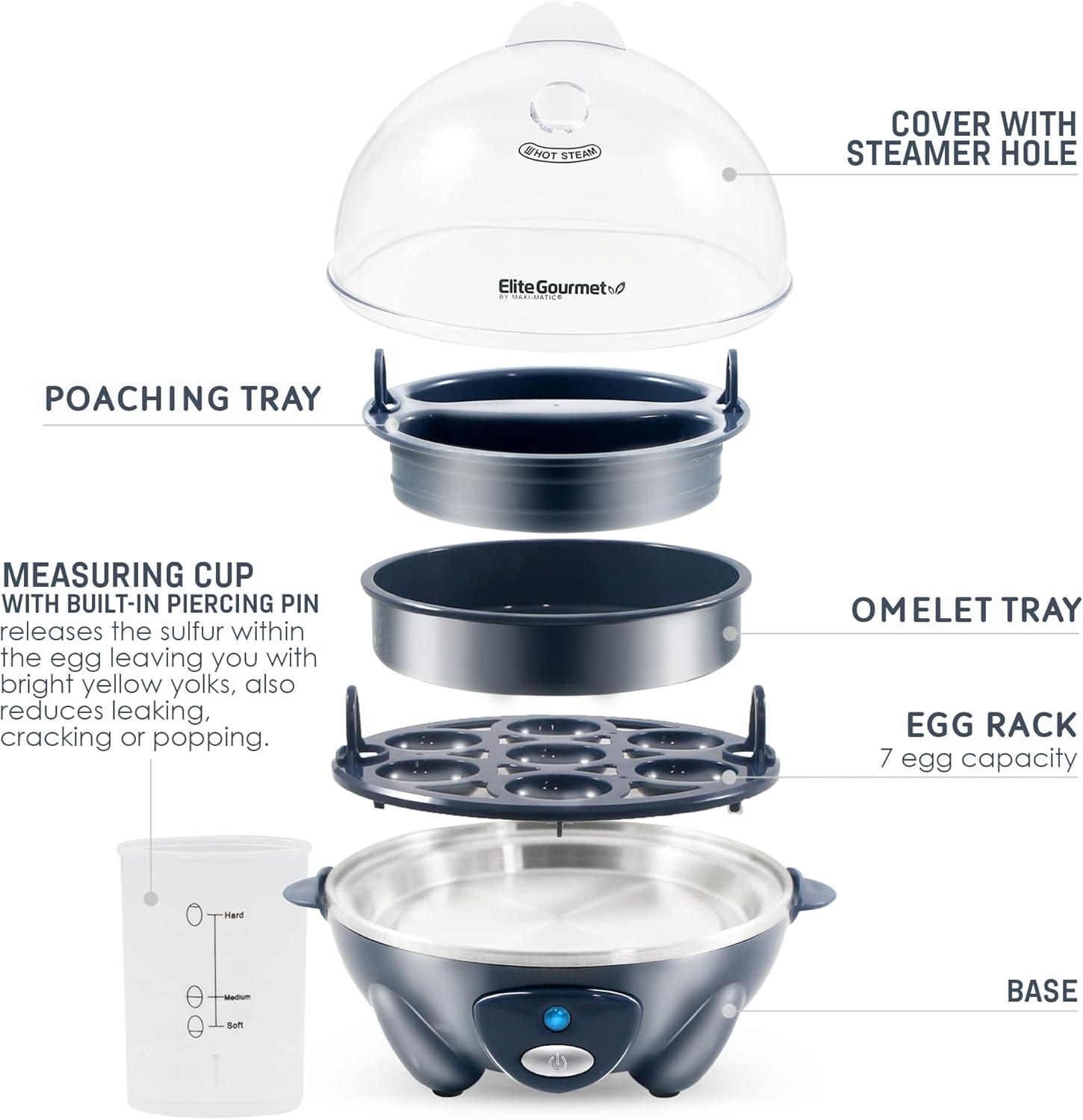 Elite Gourmet EGC700DKG# Rapid Egg Cooker, 7 Easy-To-Peel, Hard, Medium, Soft Boiled Eggs, Poacher, Omelet Maker, Auto Shut-Off, Alarm, 16-Recipe Booklet, BPA-Free, Shadow(Cobalt)