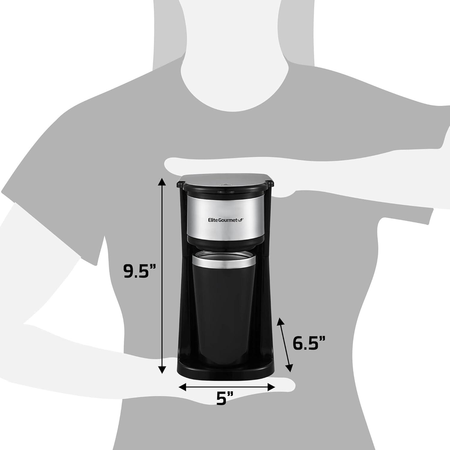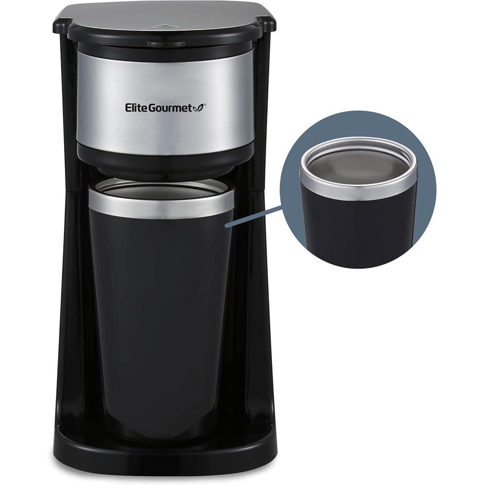 Elite Gourmet EHC-112B Personal Single-Serve Compact Coffee Maker Brewer Includes 14Oz. Thermal Travel Mug with Stainless Steel Interior, Compatible with Coffee Grounds, Reusable Filter, Black(Stainless Steel)