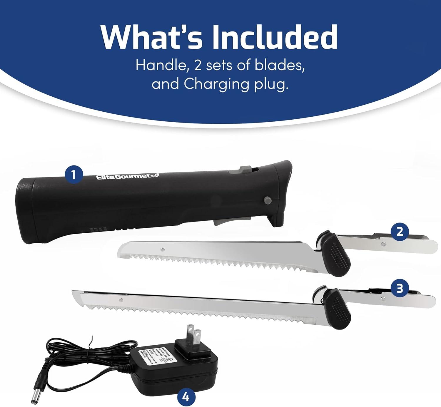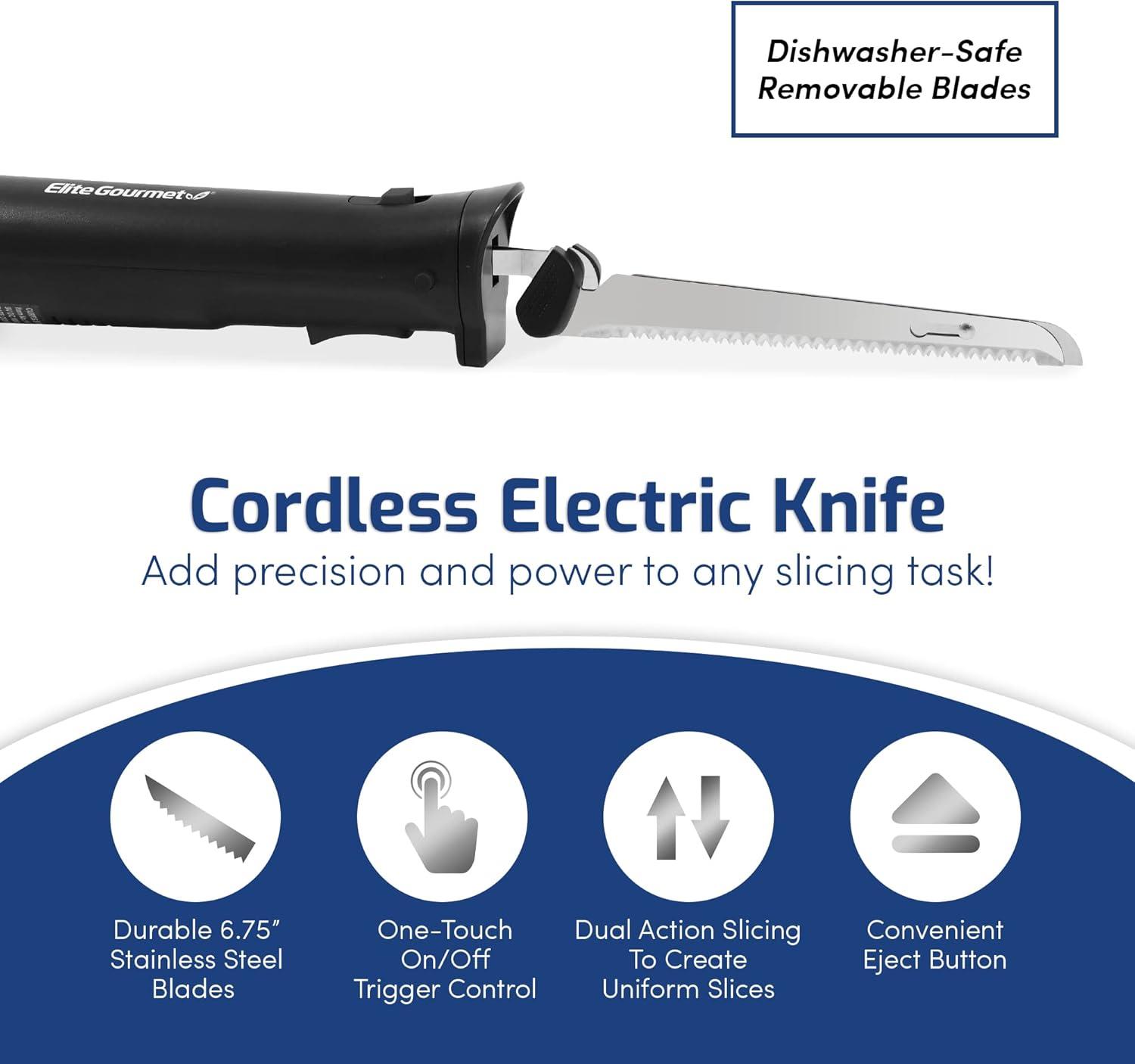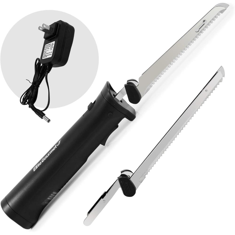 The perfect meal deserves the perfect cut, and this cordless knife delivers it all with ease. The oscillating double serrated carving blades and powerful electric motor simplifies the task allowing you to make precise cuts with little work. Move around the kitchen with ease without a cumbersome power cord. The electric knife can even be used outdoors for picnics or camping. Easily carve through roast beef, ham, turkey, vegetables and more. Slice a variety of items, from freshly baked breads, that expensive block of cheese you splurged on, or the honeyed ham you picked up for dinner, the Elite Gourmet Electric Knife makes perfect, even slices every time. No more dull blades, or shredding the holiday turkey into turkey shavings, with 2 serrated stainless steel blades and a sleek design, this is precision cutting at its best. Quick and easy cleaning! This holiday, let the grown-ups fight over who gets to carve the turkey.