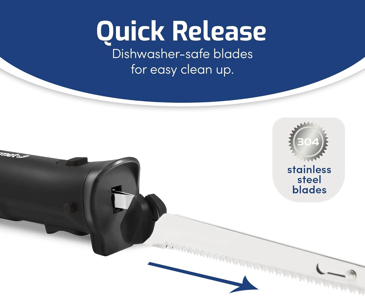 FOUR STAINLESS STEEL BLADES – This electric knife features two sets of reciprocating, serrated blades with safety finger guards.