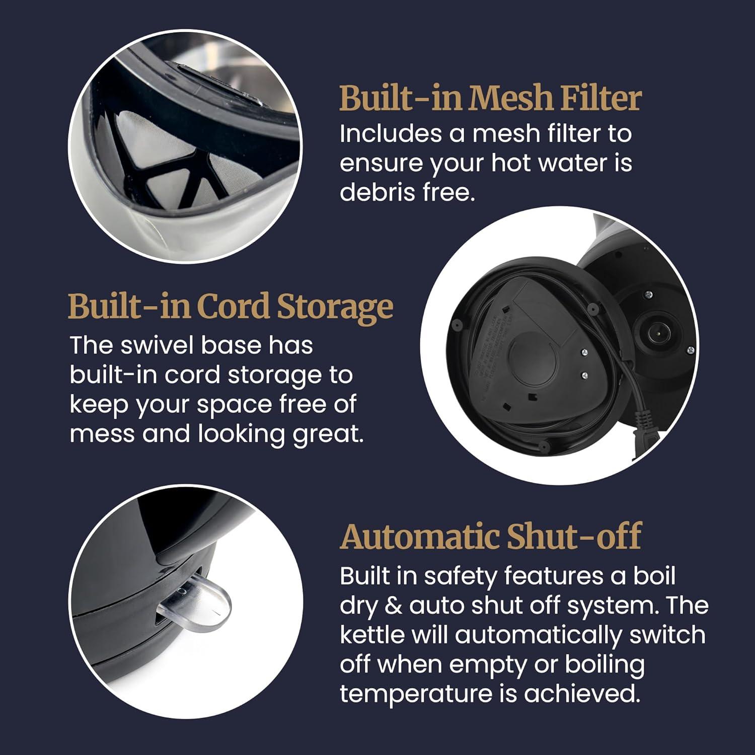 CORDLESS & PORTABLE: The glass kettle lifts on and off the 360º swivel base comfortably without burdensome cords. This easily makes the water kettle portable to pour and serve away from the kitchen wherever hot water is needed.