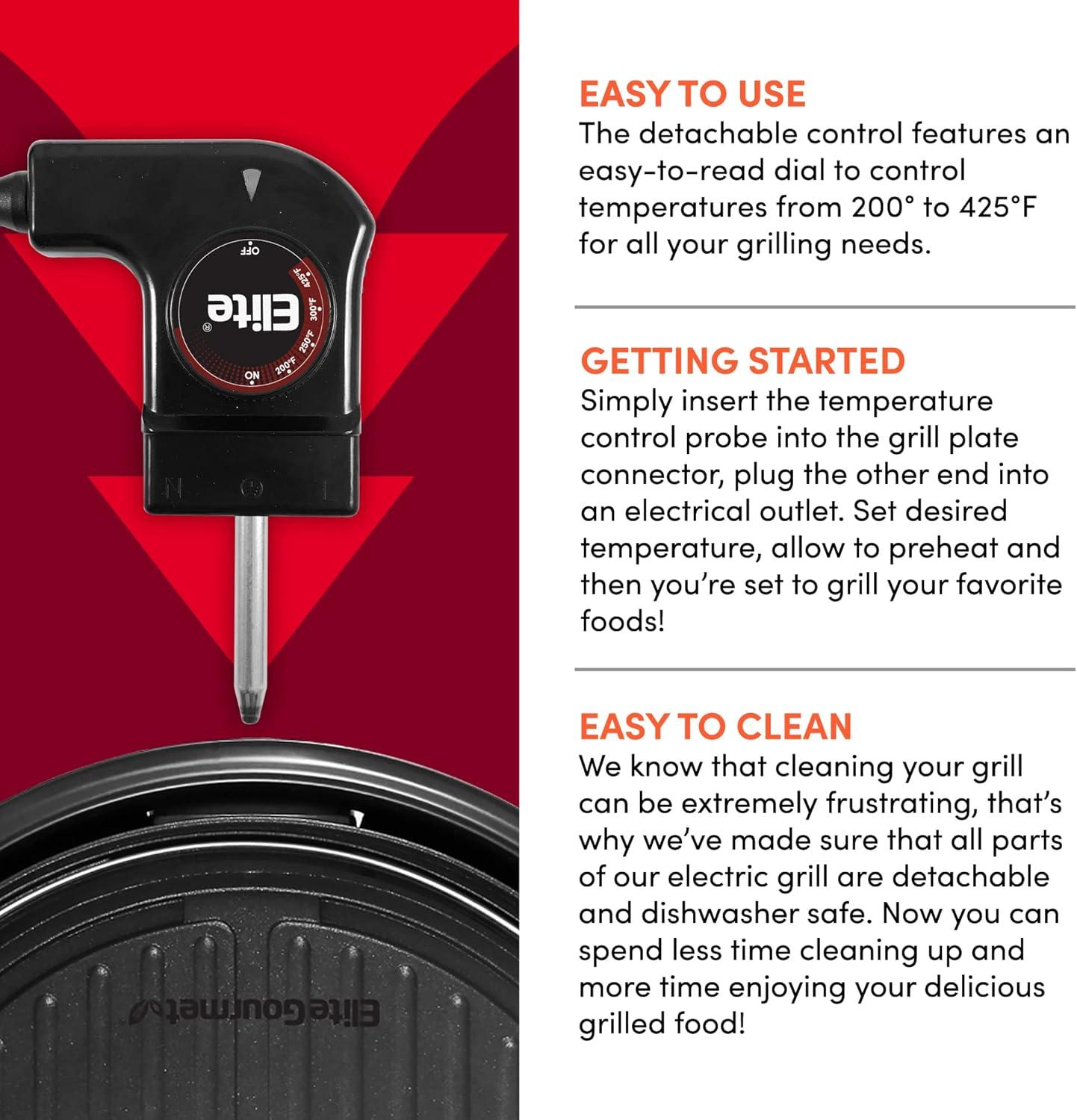 ENJOY LOW-FAT, HEALTHY RECIPES EFFORTLESSLY! – The Elite Gourmet indoor grill features a circular heating element that allows it to heat up faster and more evenly, so you can cook everything to perfection! Fat will drip away from your food through the grilling channels and a cool-touch base & handles help to prevent nasty burns!