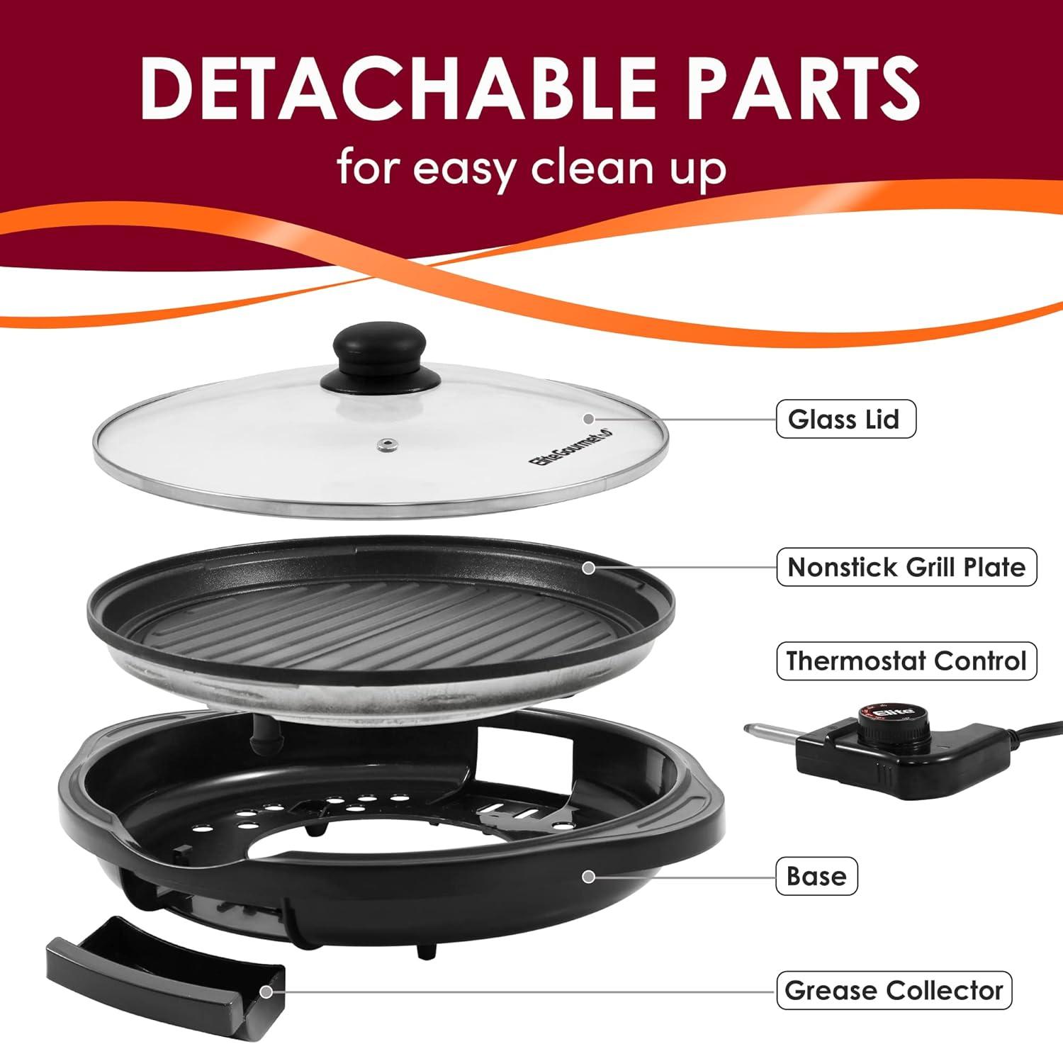 imageElite Gourmet EMG1100 11quot Electric Indoor Nonstick Grill Dishwasher Safe Cool Touch Fast Heat Up Ideal LowFat Meals Includes Tempered Glass Lid Black12