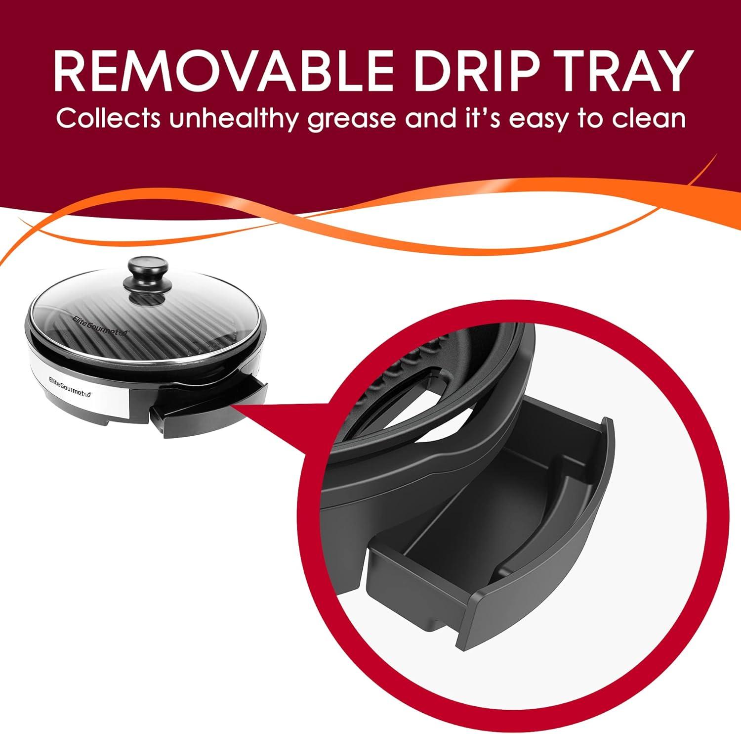 ENJOY LOW-FAT, HEALTHY RECIPES EFFORTLESSLY! – The Elite Gourmet indoor grill features a circular heating element that allows it to heat up faster and more evenly, so you can cook everything to perfection! Fat will drip away from your food through the grilling channels and a cool-touch base & handles help to prevent nasty burns!