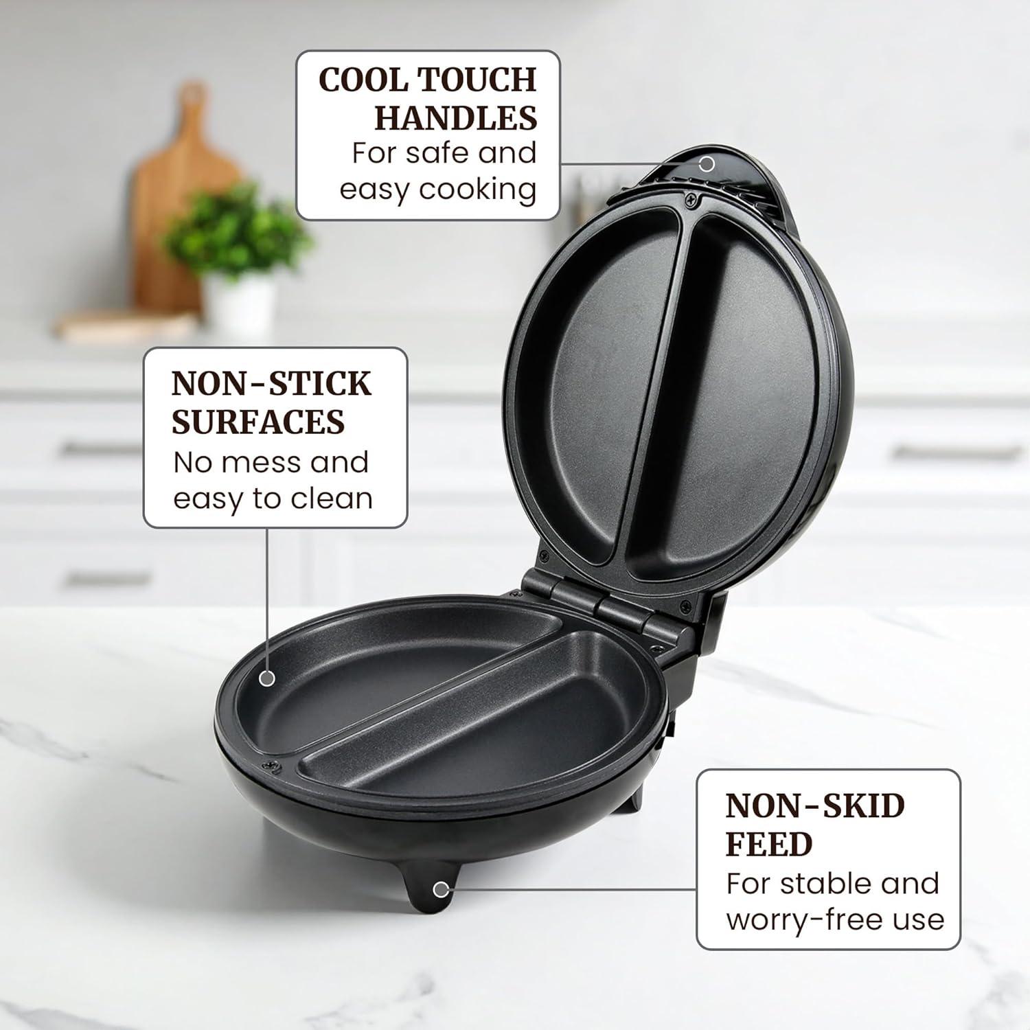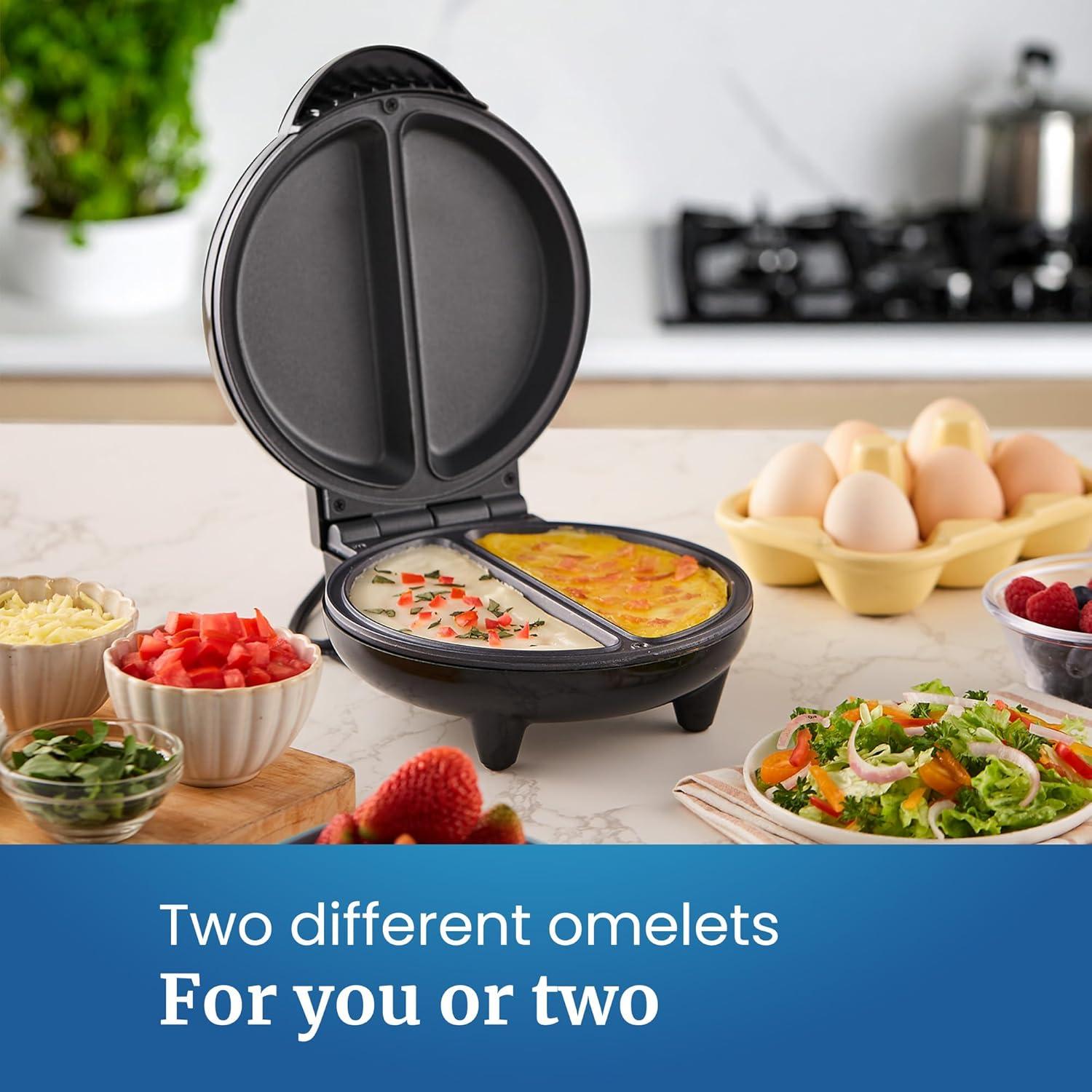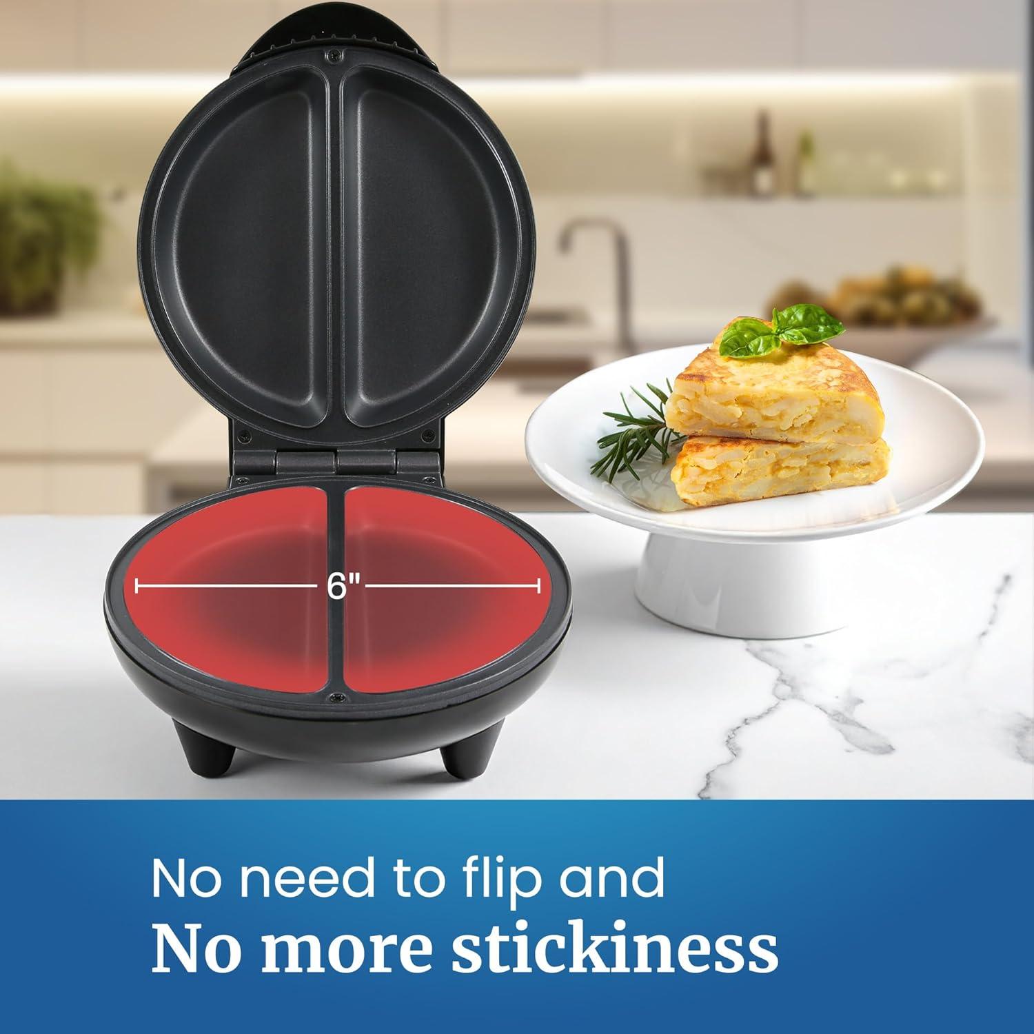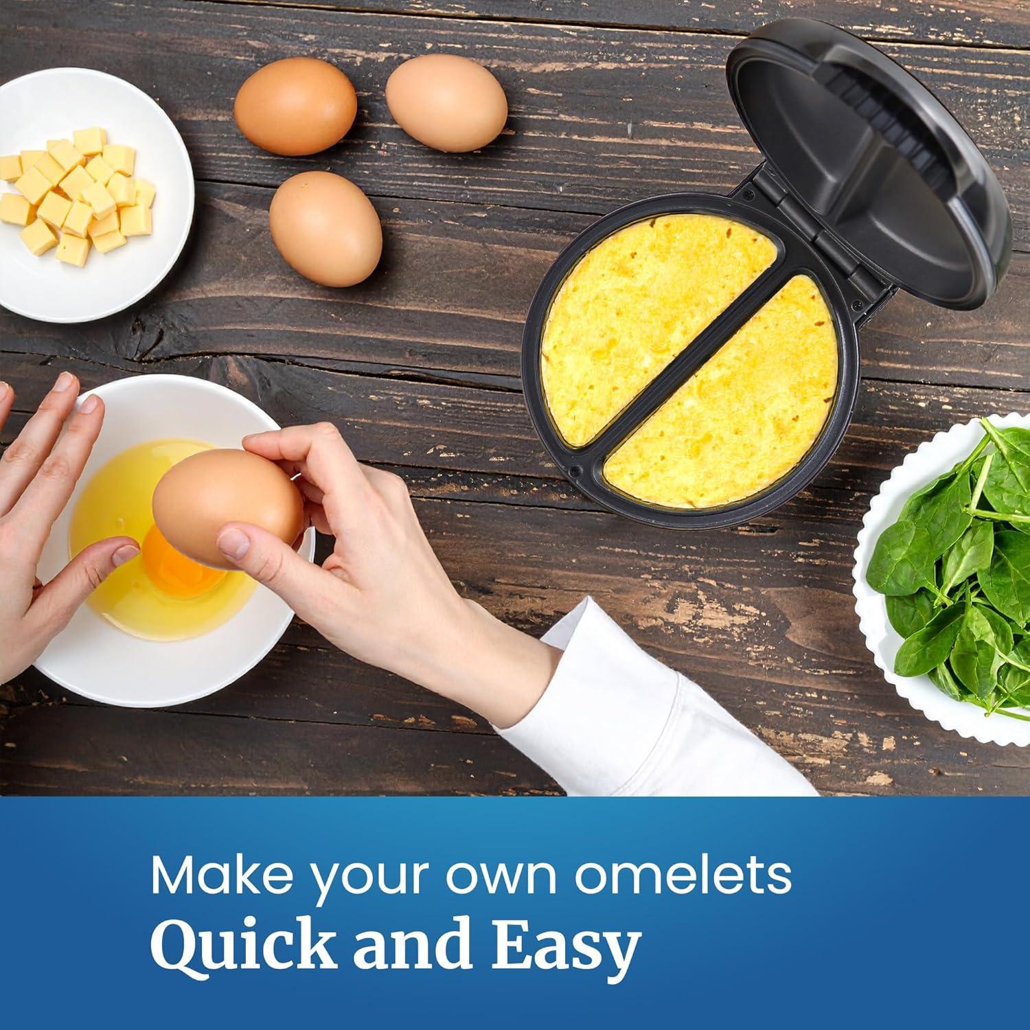 The NON-STICK COOKING SURFACE can make up to two individual portions of fluffy omelets or snacks in just minutes. Each Omelet sized 6.5″ x 3” x 1.5”.