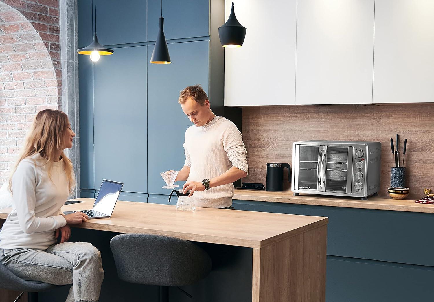 The Elite Gourmet 5-Multifunction countertop toaster oven broiler is the perfect all-in-one kitchen appliance. A great addition to any kitchen, It can broil, bake, toast, keep warm and has a rotisserie function. Its large 23L/6 slice/0. 8 Cubic feet capacity cooks meals big enough for the whole family and can even bake up to a 12″ Pizza! With this many functions in a toaster oven, It was built to make cooking in the kitchen Easy and convenient. The extra-large capacity of this toaster oven is perfect for your big holiday get-togethers or neighborhood parties. Consistent heating up to 450 degrees F and 1500 watts of power make this countertop toaster oven broiler the ultimate powerhouse!