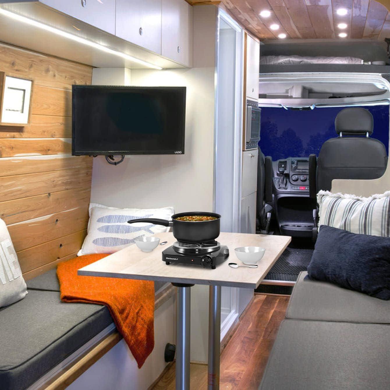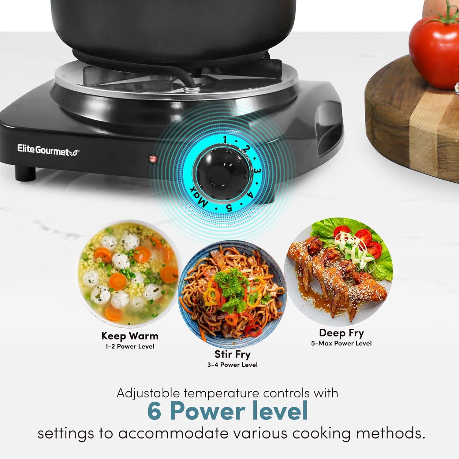 Cooking is quick, easy and consistent with the Elite Gourmet Electric Single Buffet Burner. This portable electric hot plate offers reliable heating and takes up minimal cooking space. At 1,000 watts, it heats up quickly with an adjustable temperature knob. The non-stick cast iron hot plate will ensure even cooking and makes clean up a breeze. It features adjustable temperature control with Off, Warm, Low, Medium, and High settings. The heavy duty cast-iron flat heating plate is easy to clean. The cool-touch base and non-skid rubber feet for stable cooking. It's perfect when you need an extra heat source for holiday cooking and entertaining, or simply use it to keep food warm at a buffet station.