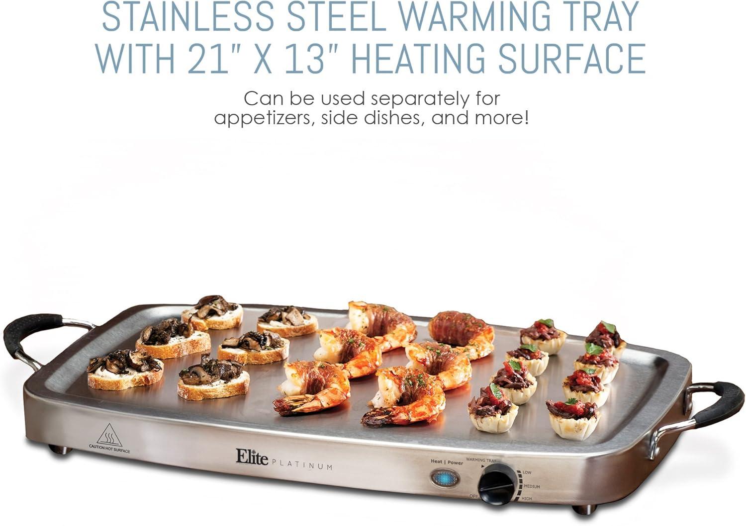 STAINLESS STEEL WARMING BASE: Use the warming base as a stand-alone warmer with your own pans and dishes, or simply place small hors d'oeuvres directly on the base to keep warm.